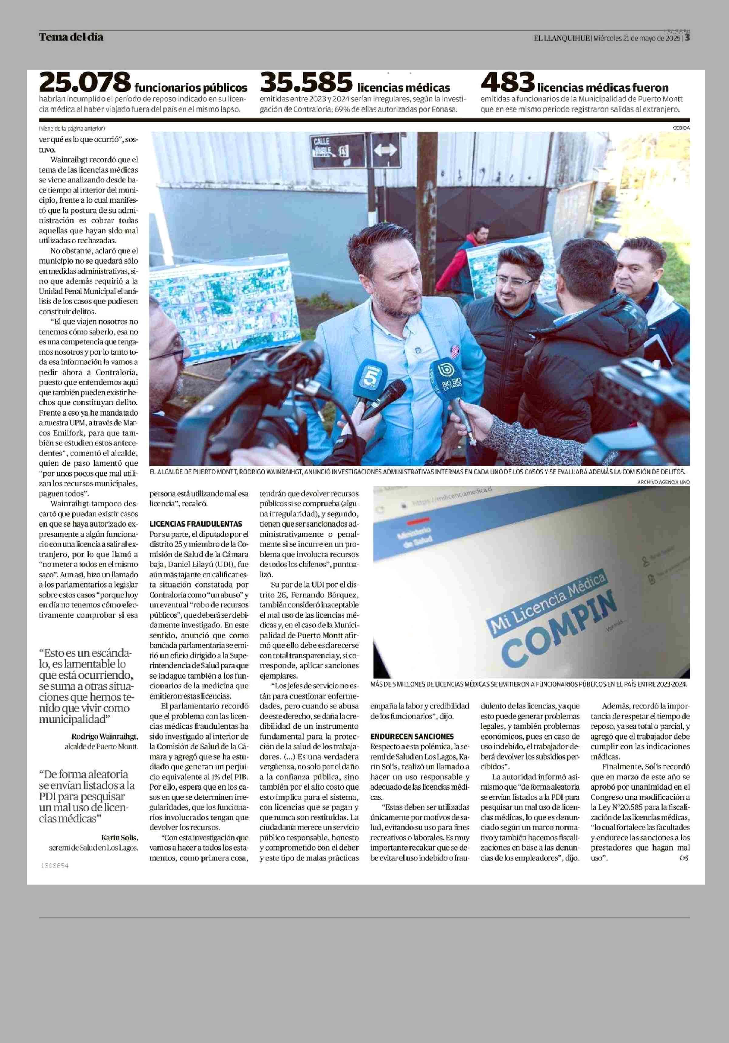 Contraloría detecta 483 licencias médicas emitidas a funcionarios municipales que salieron del país 21-05-2025 El Llanquihue |