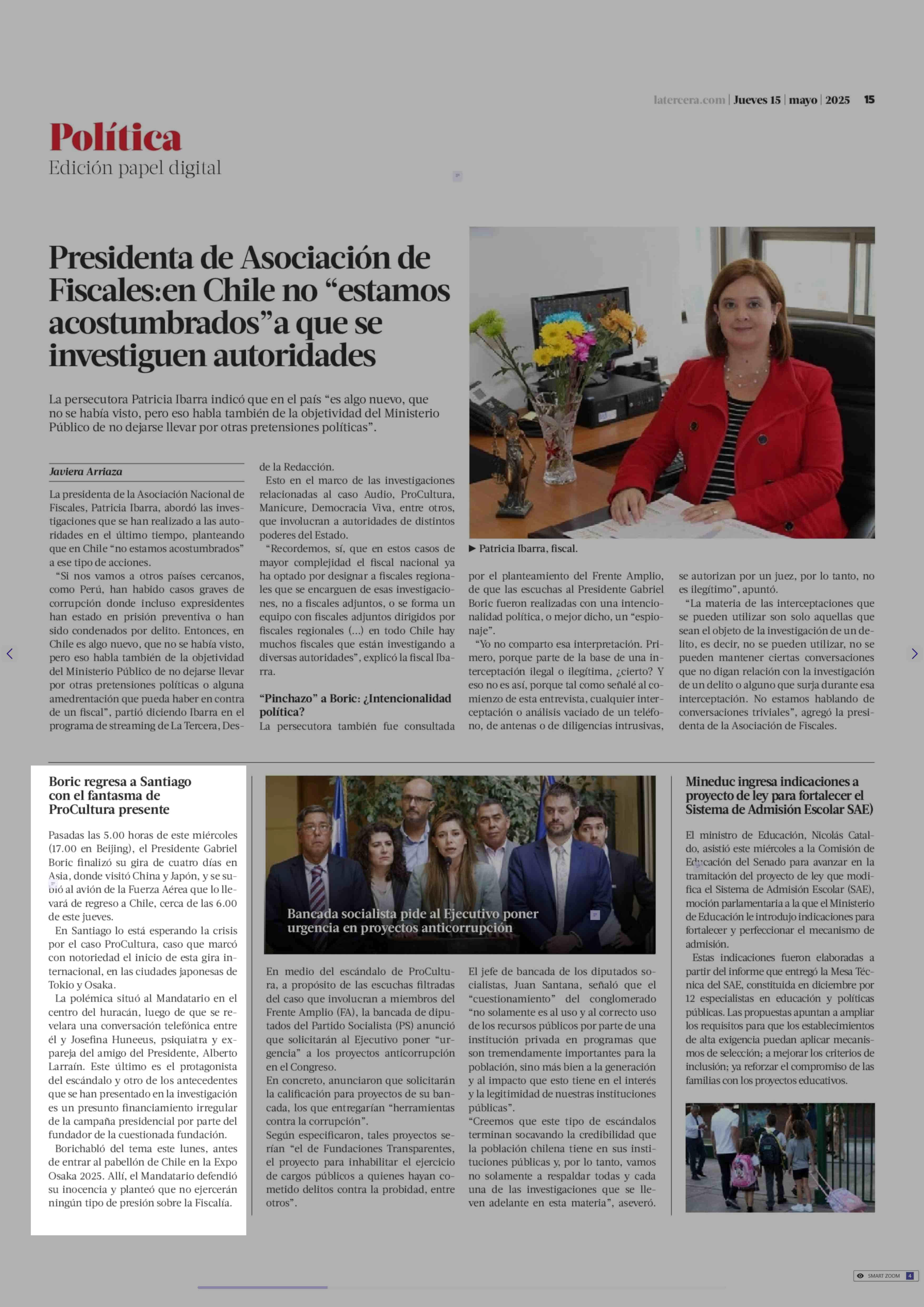 Boric regresa a Santiago con el fantasma de ProCultura presente 15-05-2025 La Tercera |