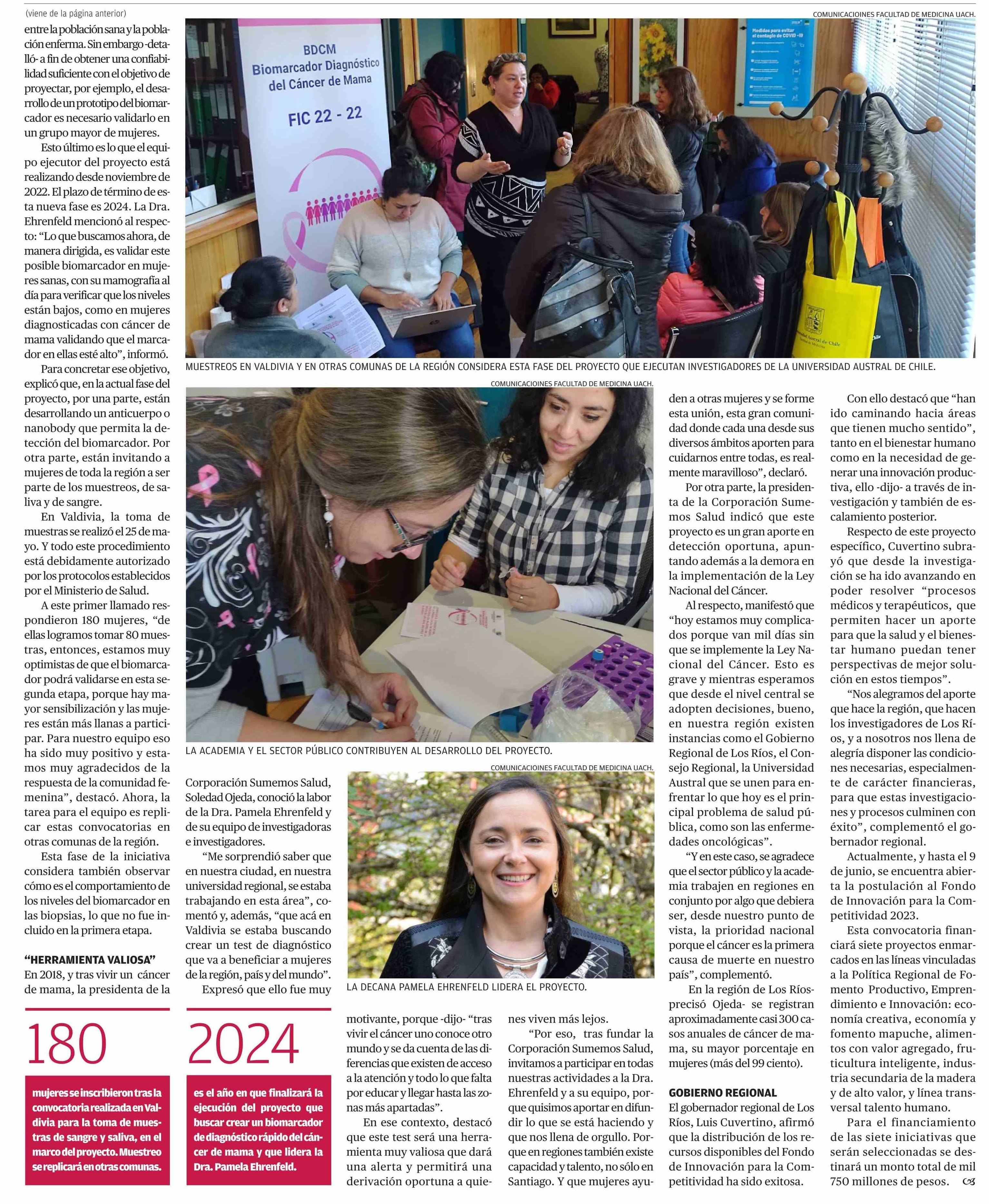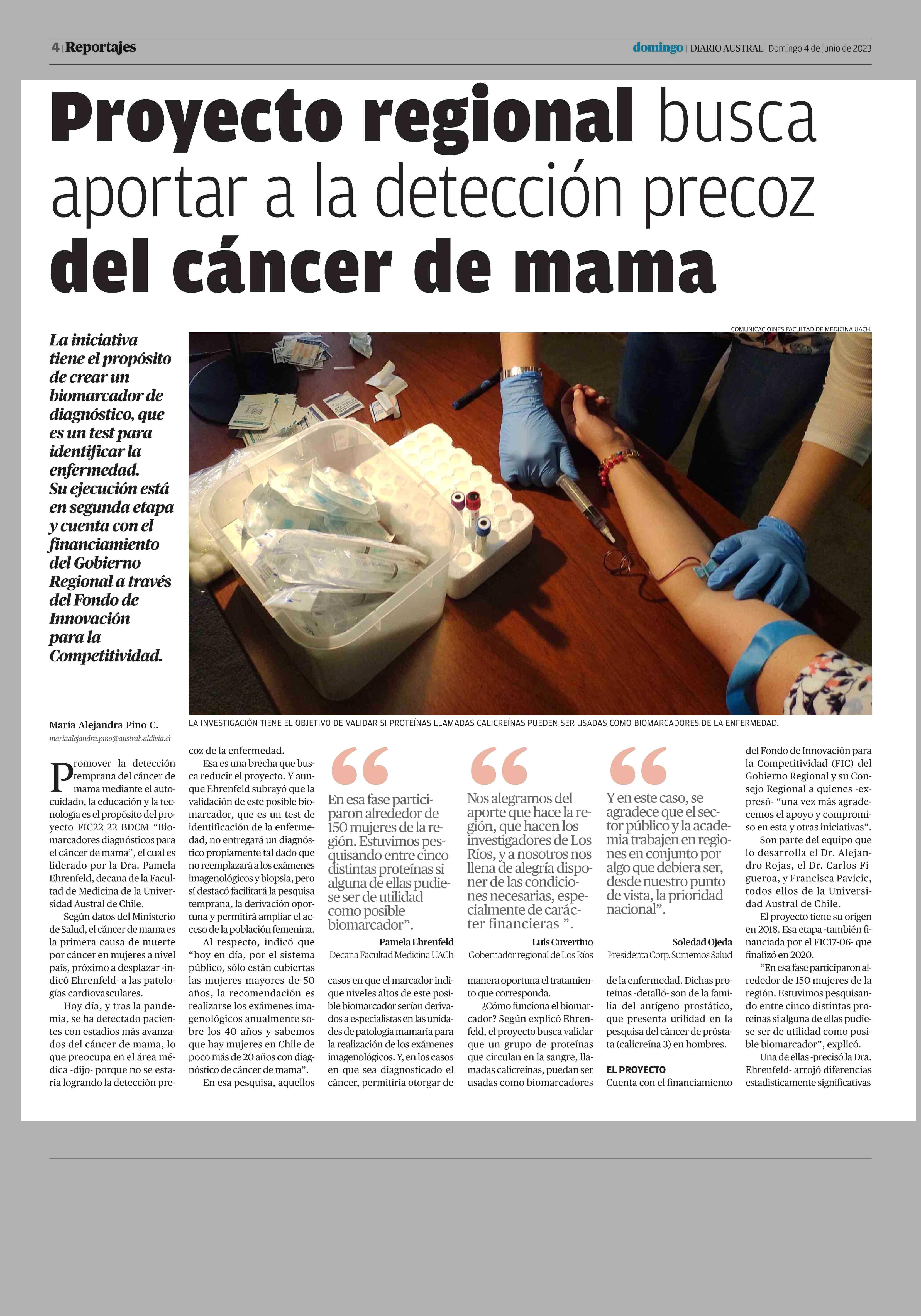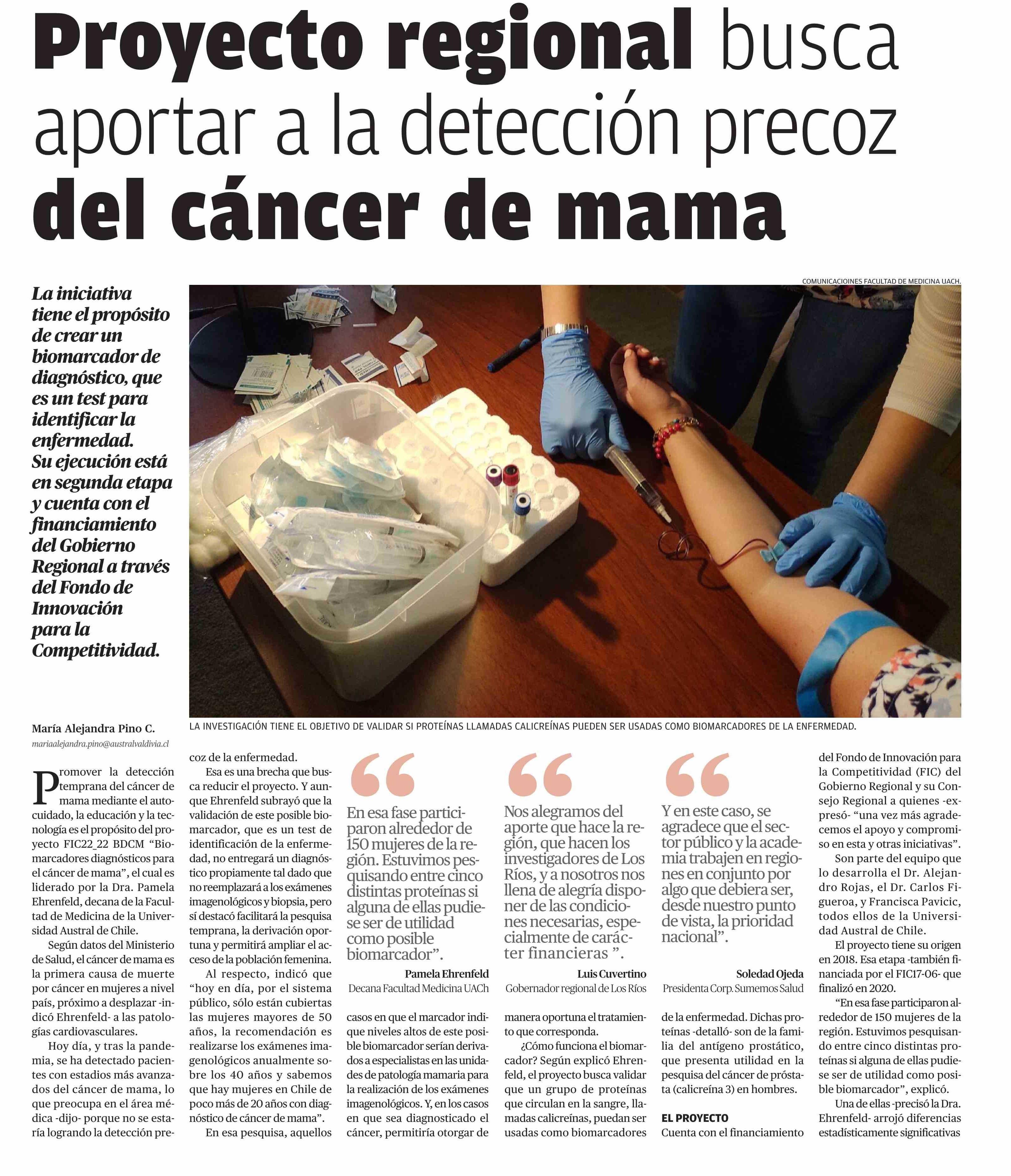 Proyecto regional busca aportar a la detección precoz del cáncer de mama 04-06-2023 Diario Austral Región de Los Ríos |