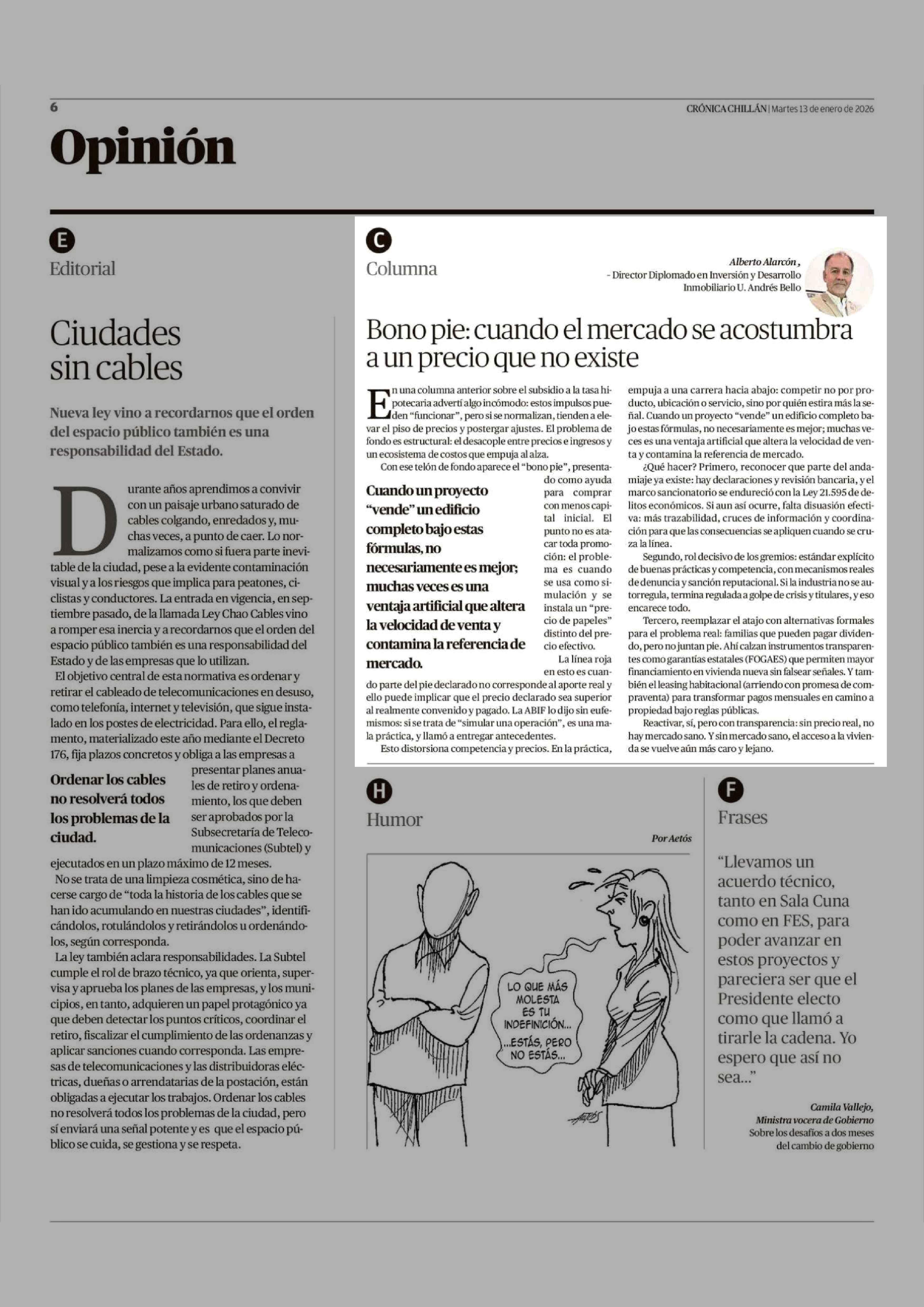 Columnas de Opinión: Bono pie: cuando el mercado se acostumbra a un precio que no existe 13-01-2026 Crónica de Chillán |