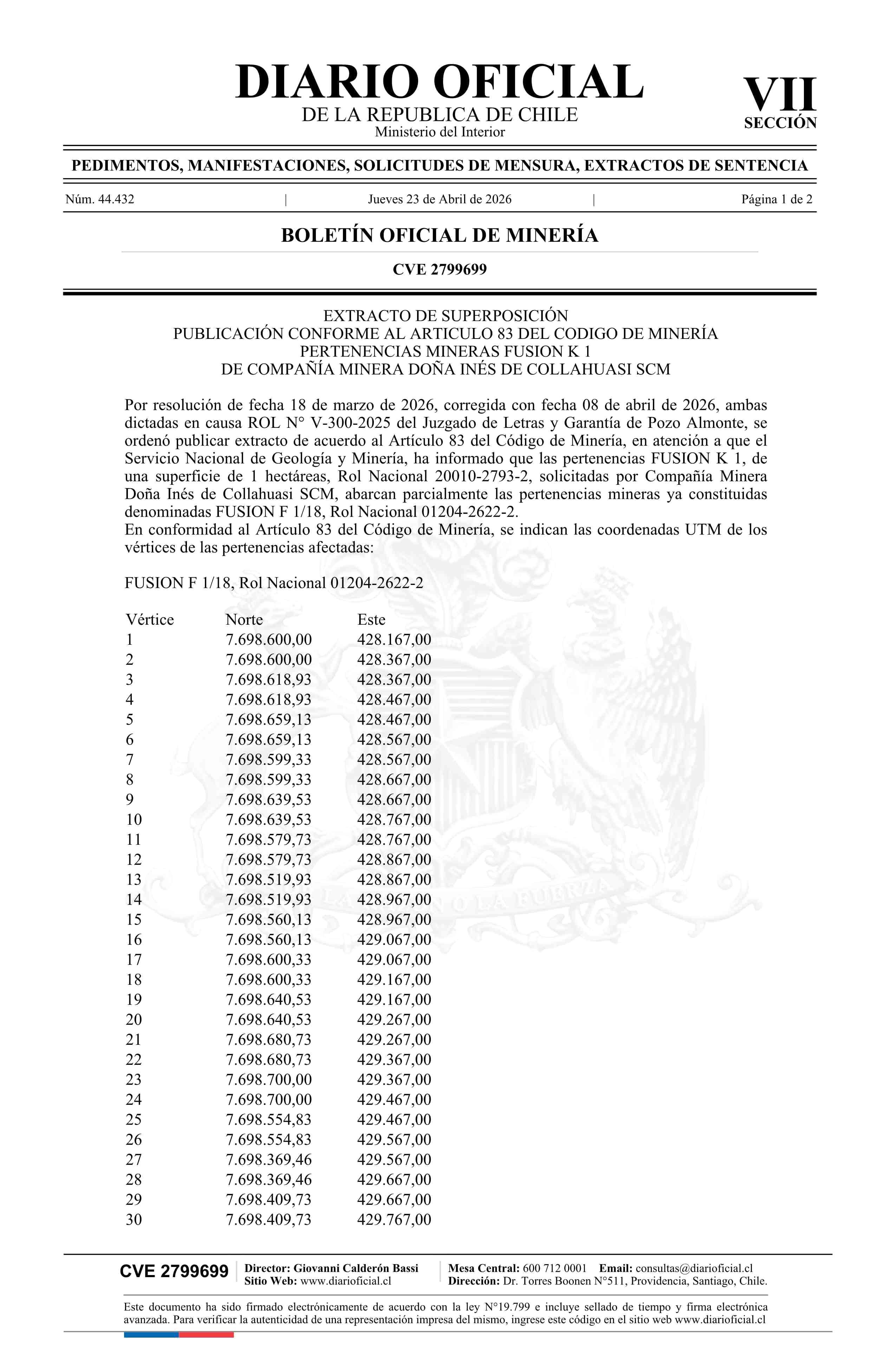 FUSION K 1 / Compañía Minera Doña Inés de Collahuasi SCM 23-04-2026 DIARIO OFICIAL CHILE - BOLETÍN OFICIAL DE MINERÍA |