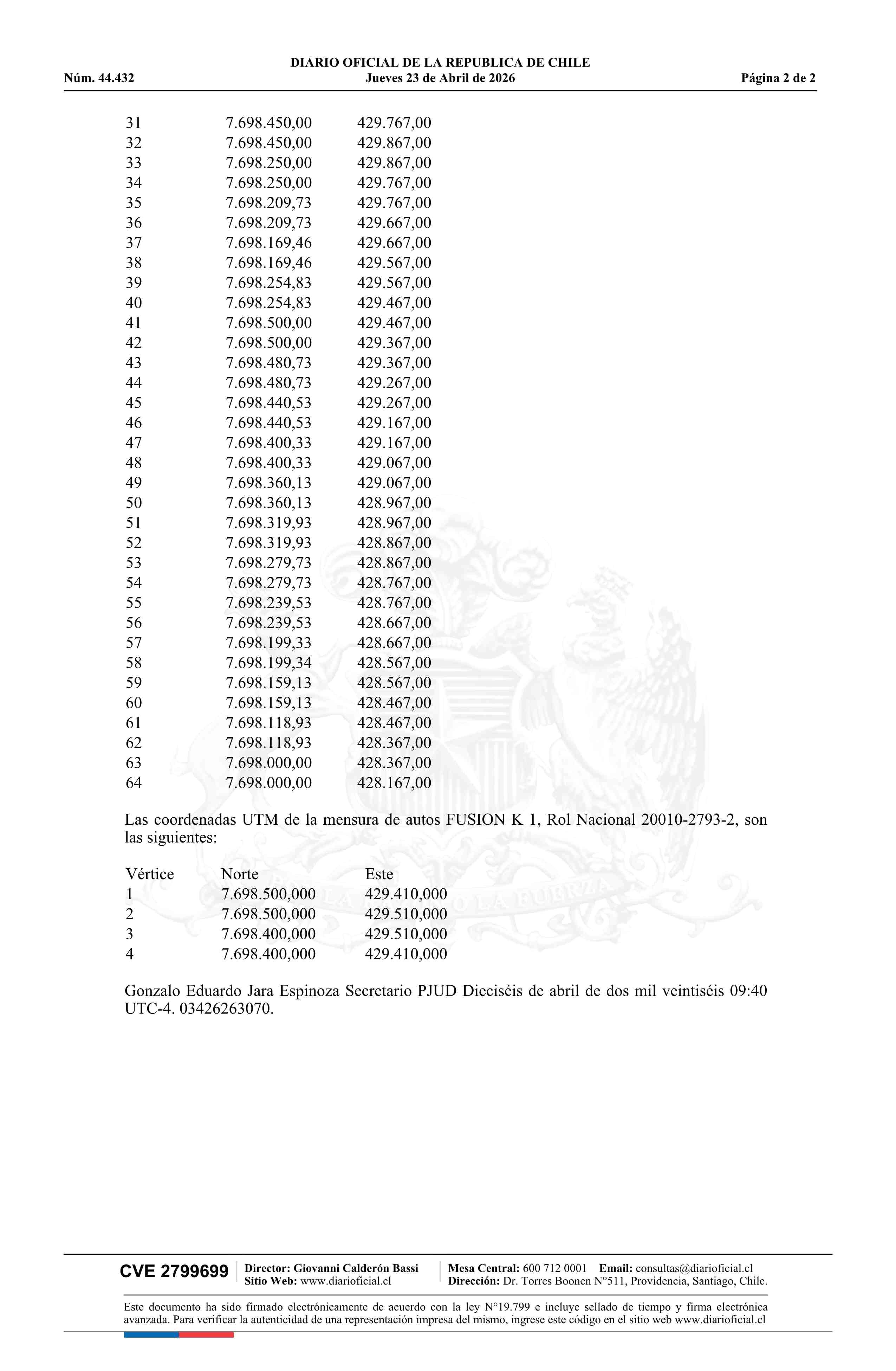 | Fuente: | DIARIO OFICIAL CHILE - BOLETÍN OFICIAL DE MINERÍA (DIARIO OFICIAL CHILE – BOM – EXTRACTOS ARTÍCULO 83) | Página(s): | 3-4 |