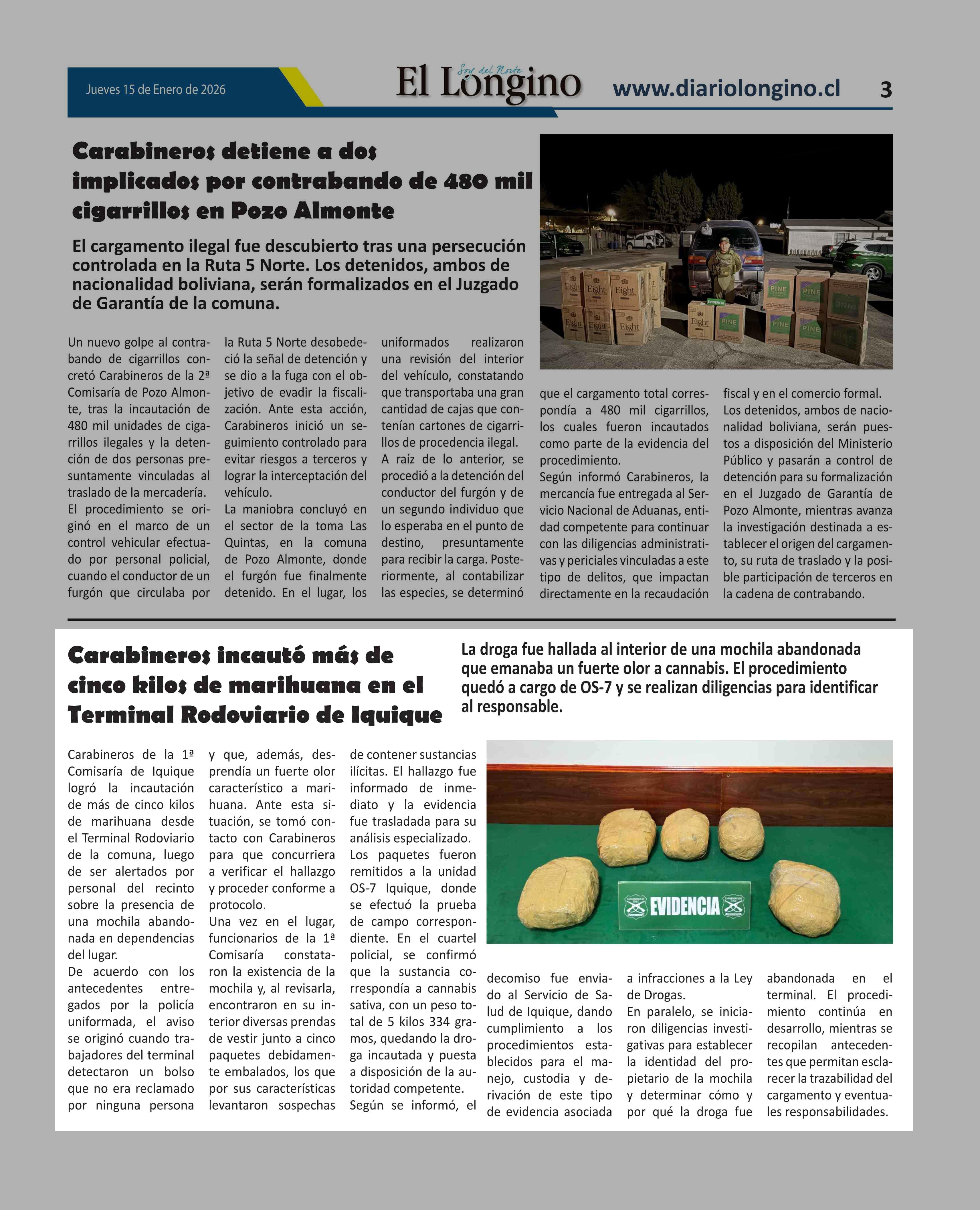 Carabineros incautó más de cinco kilos de marihuana en el Terminal Rodoviario de Iquique 15-01-2026 El Longino |