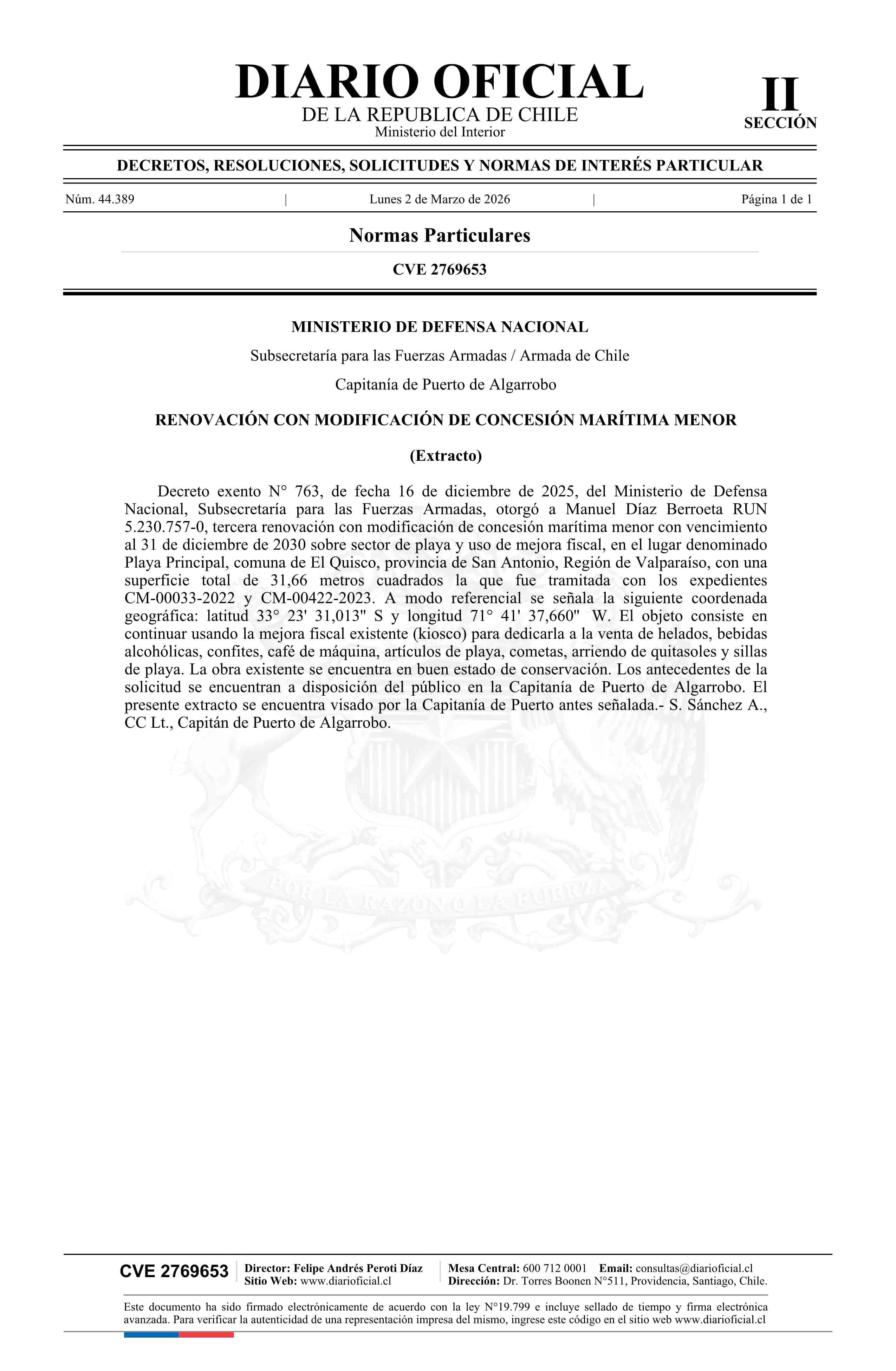 Extracto de decreto exento número 763, de 2025.- Renovación con modificación de concesión marítima menor 02-03-2026 Diario Oficial Edición Electrónica |