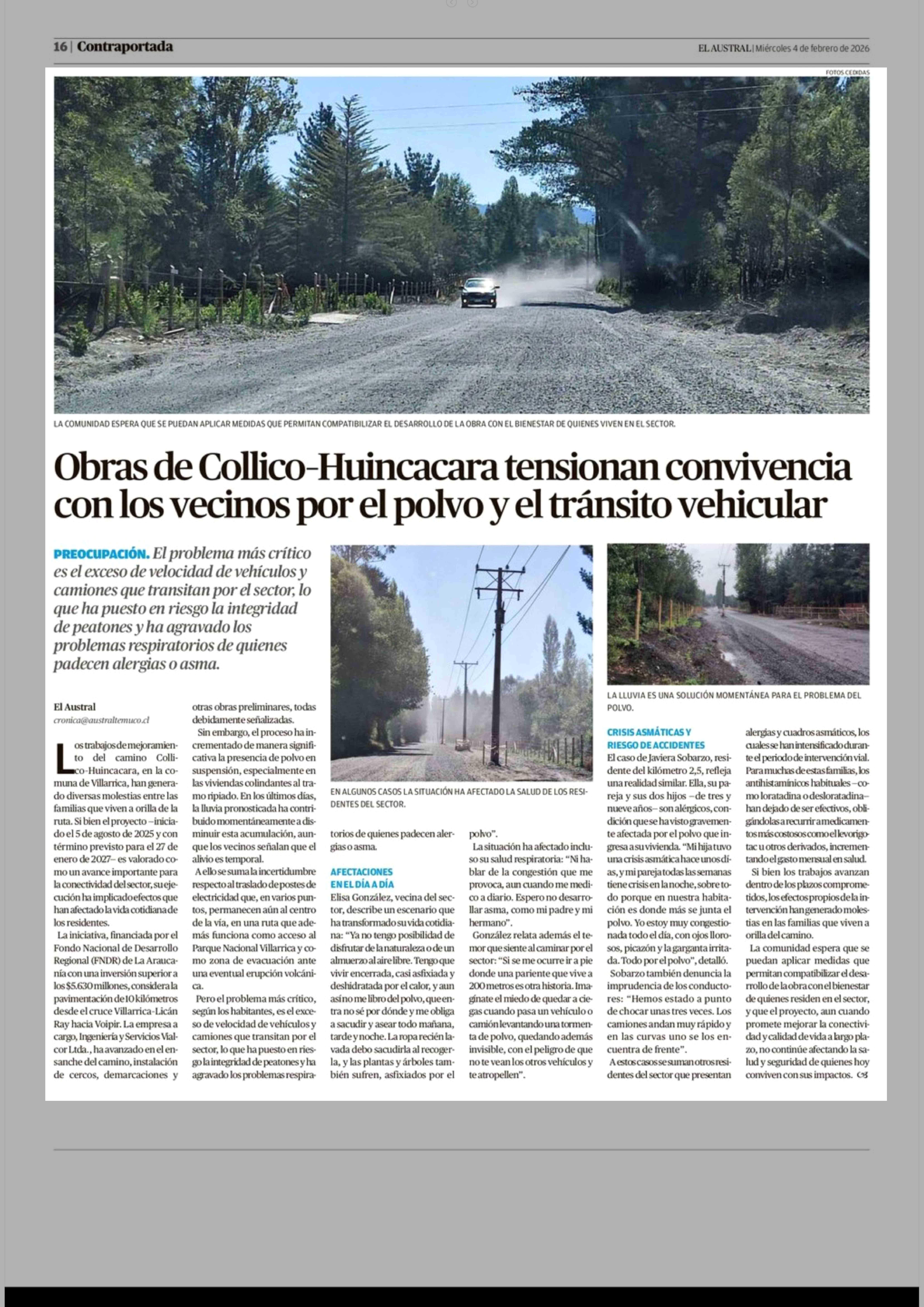 Obras de Collico-Huincacara tensionan convivencia con los vecinos por el polvo y el tránsito vehicular 04-02-2026 El Austral de la Araucanía |