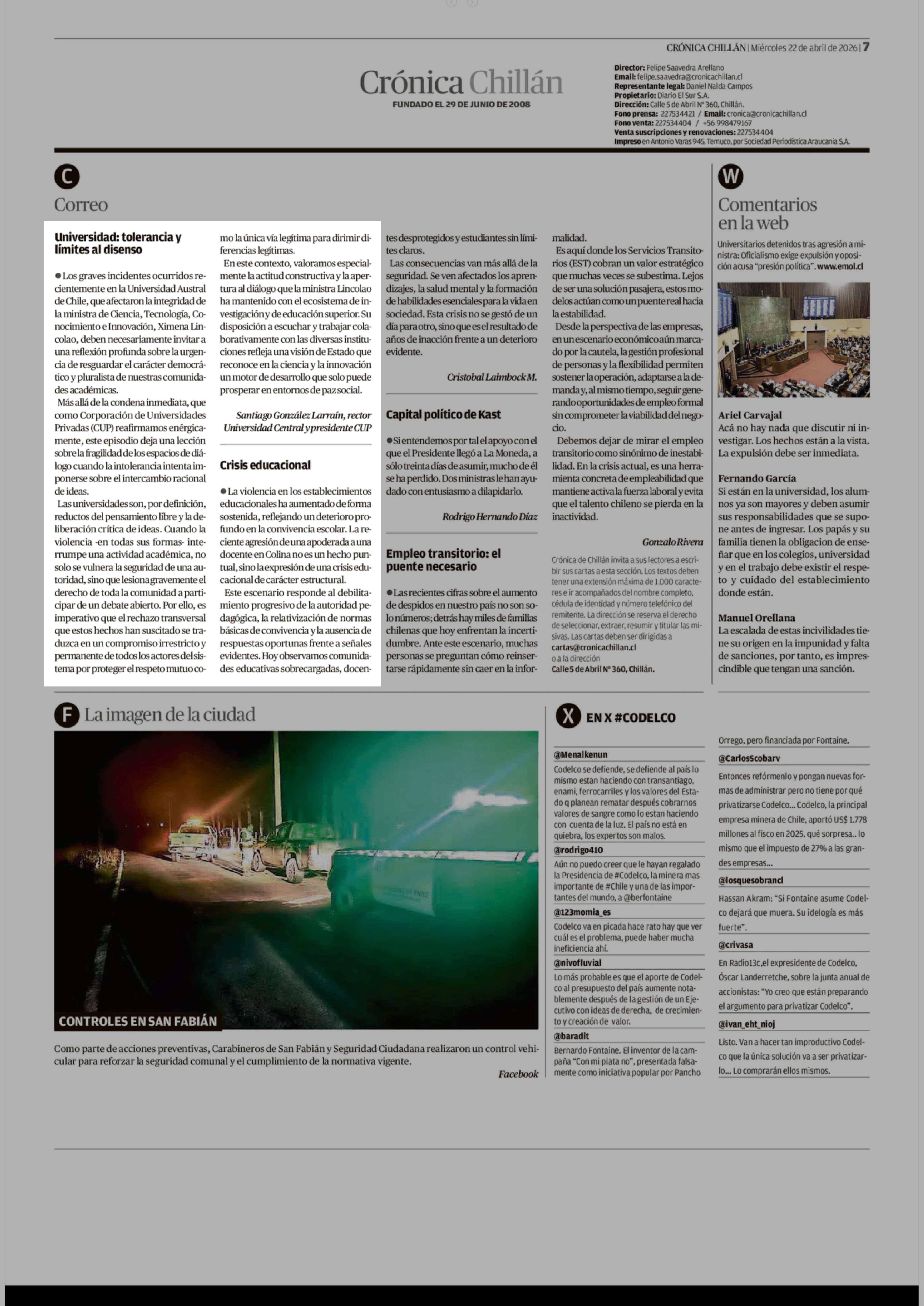Cartas: Universidad: tolerancia y límites al disenso 22-04-2026 Crónica de Chillán |