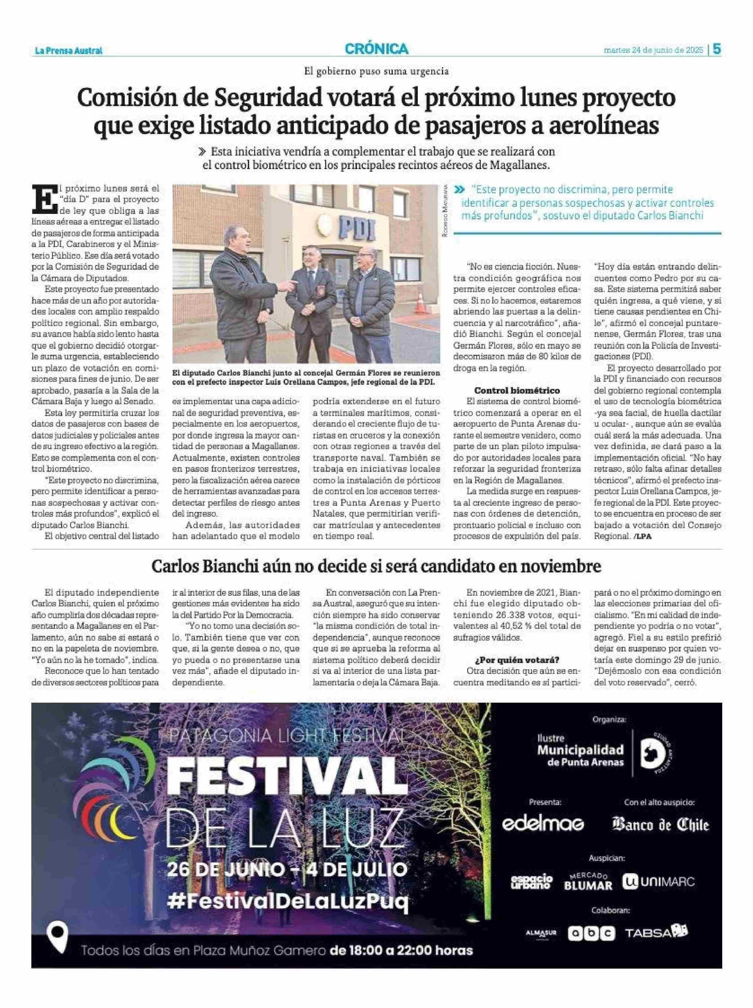 Comisión de Seguridad votará el próximo lunes proyecto que exige listado anticipado de pasajeros a aerolíneas 24-06-2025 La Prensa Austral |