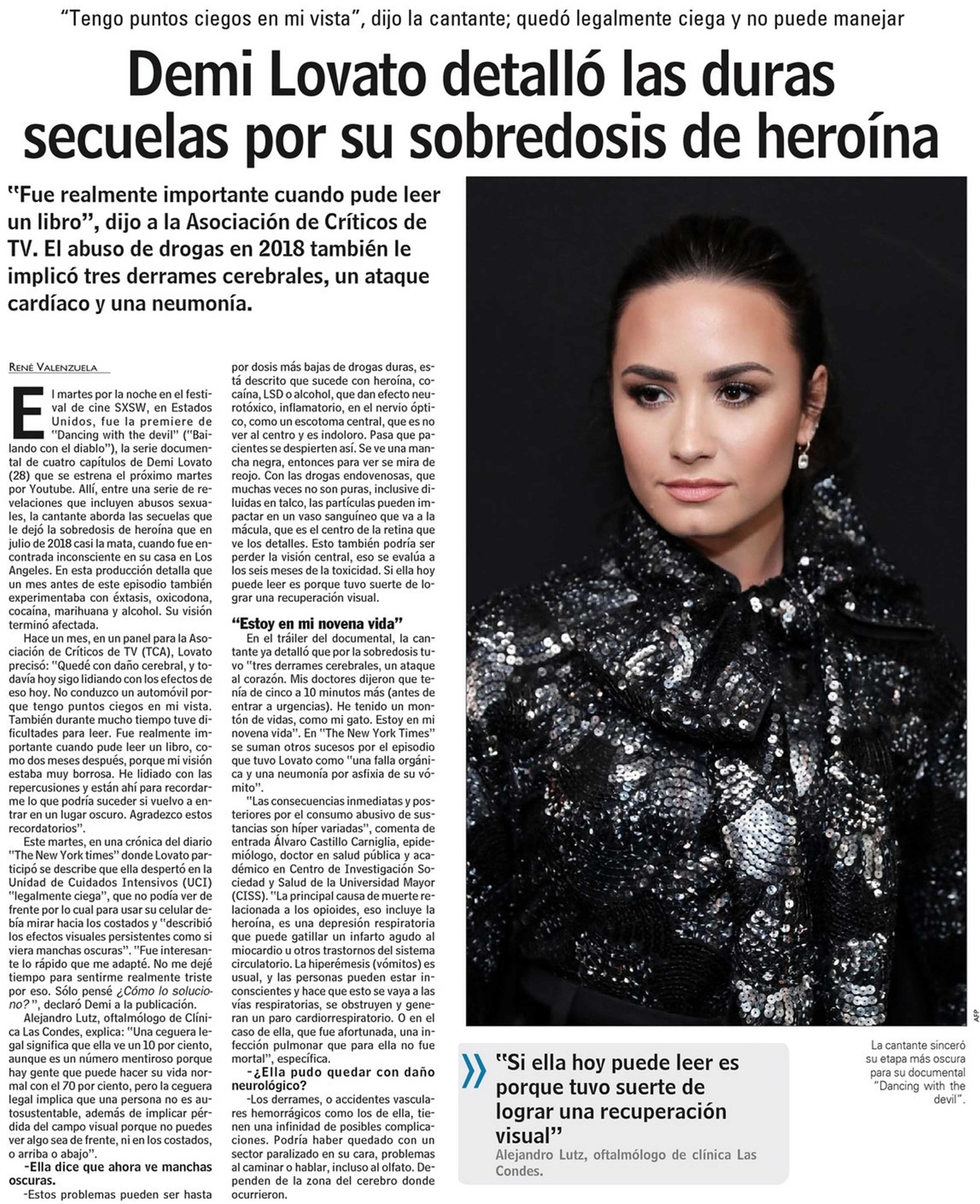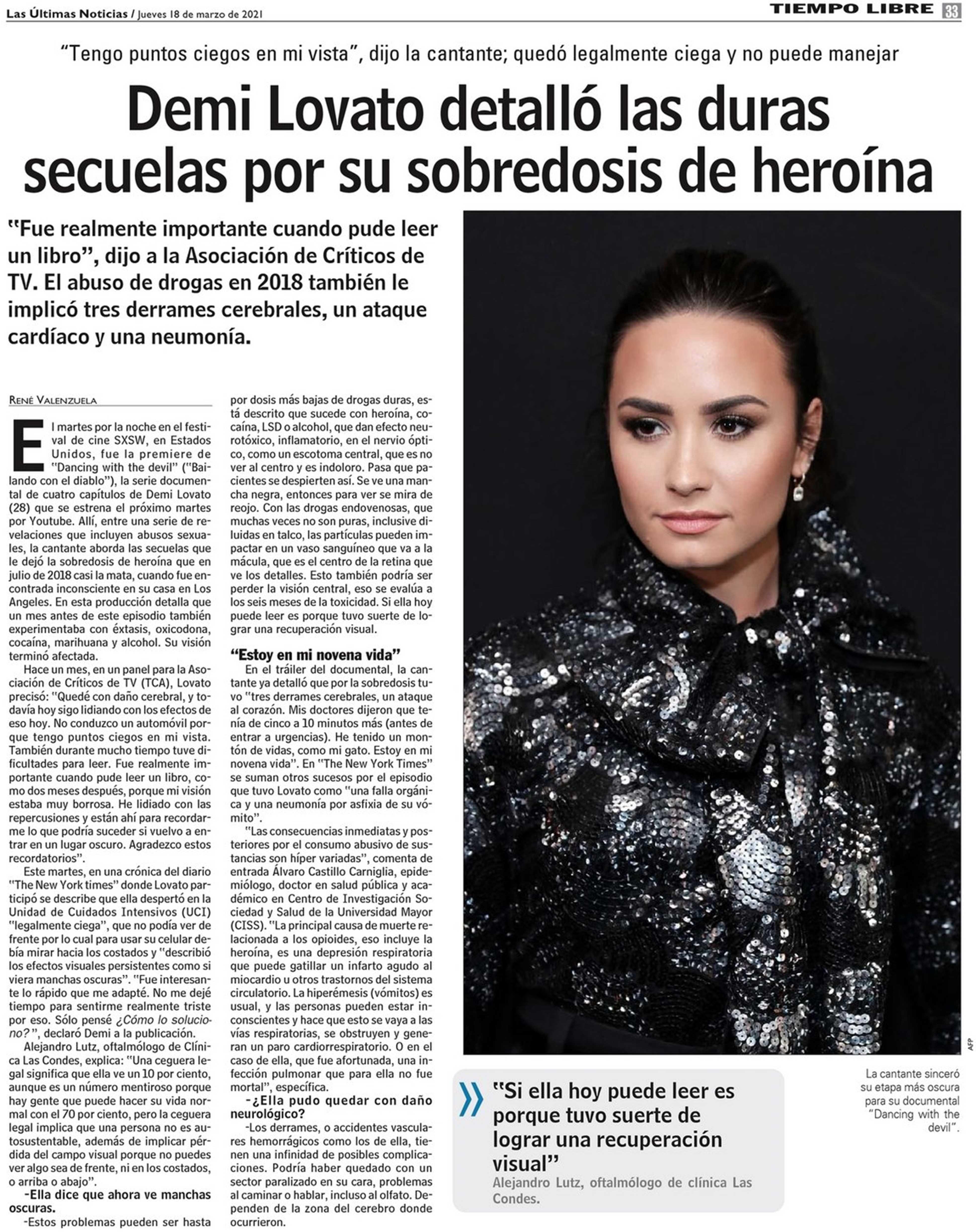Demi Lovato detalló las duras secuelas por su sobredosis de heroína 18-03-2021 Las Últimas Noticias |