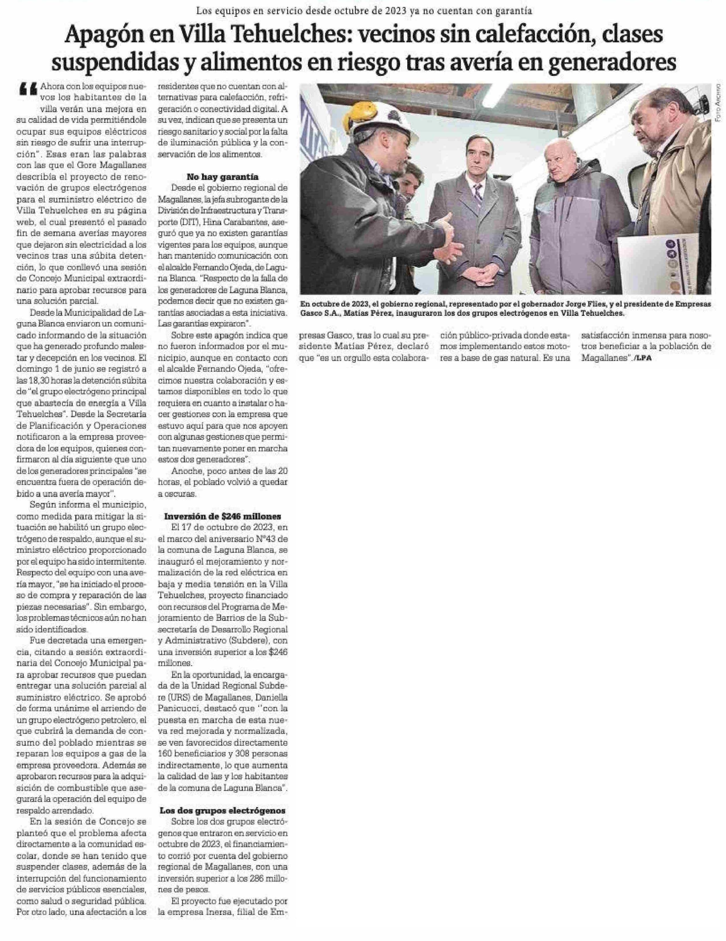 Apagón en Villa Tehuelches: vecinos sin calefacción, clases suspendidas y alimentos en riesgo tras avería en generadores 05-06-2025 La Prensa Austral |