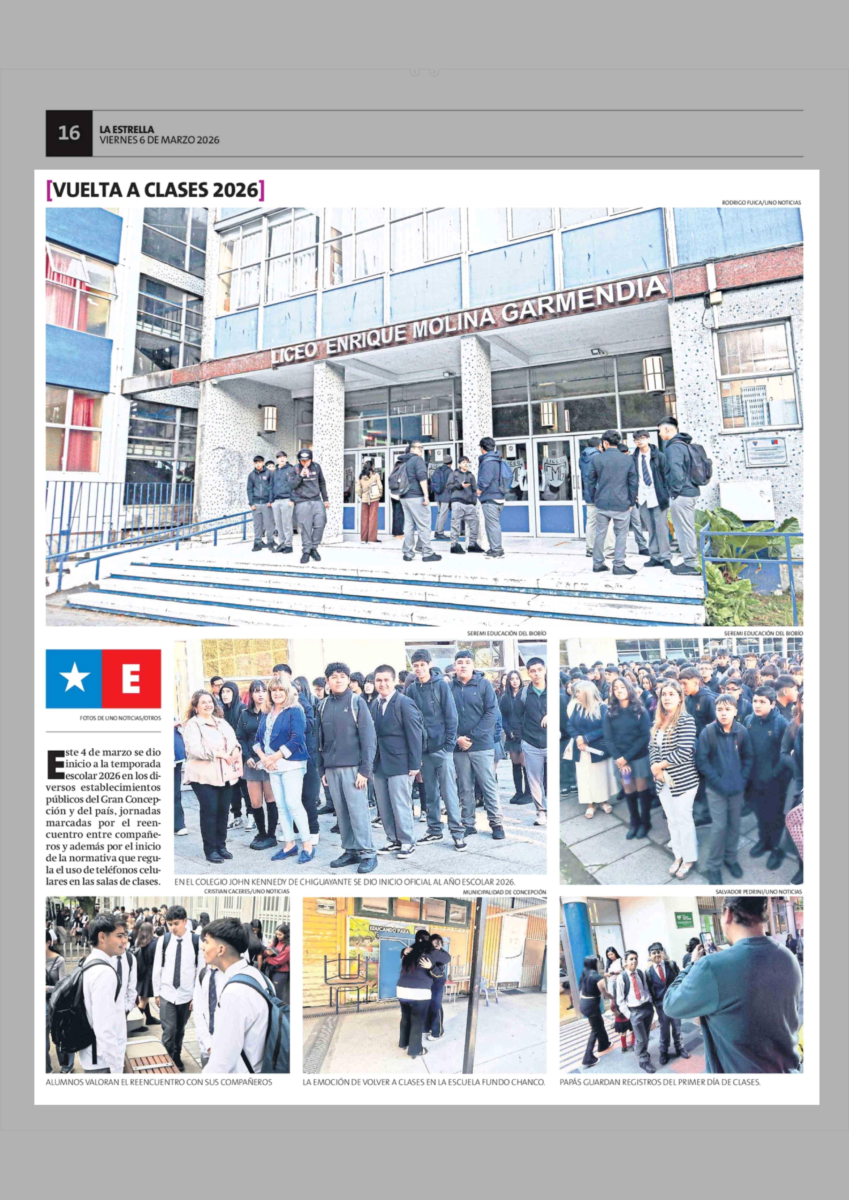 | Título: | escolar 2026 en los diversos establecimientos públicos del Gran Concepción y del país, jornadas marcadas por el reencuentro entre compañeros y además por el inicio de la normativa que regula el uso de teléfonos celulares en las salas de clases. |