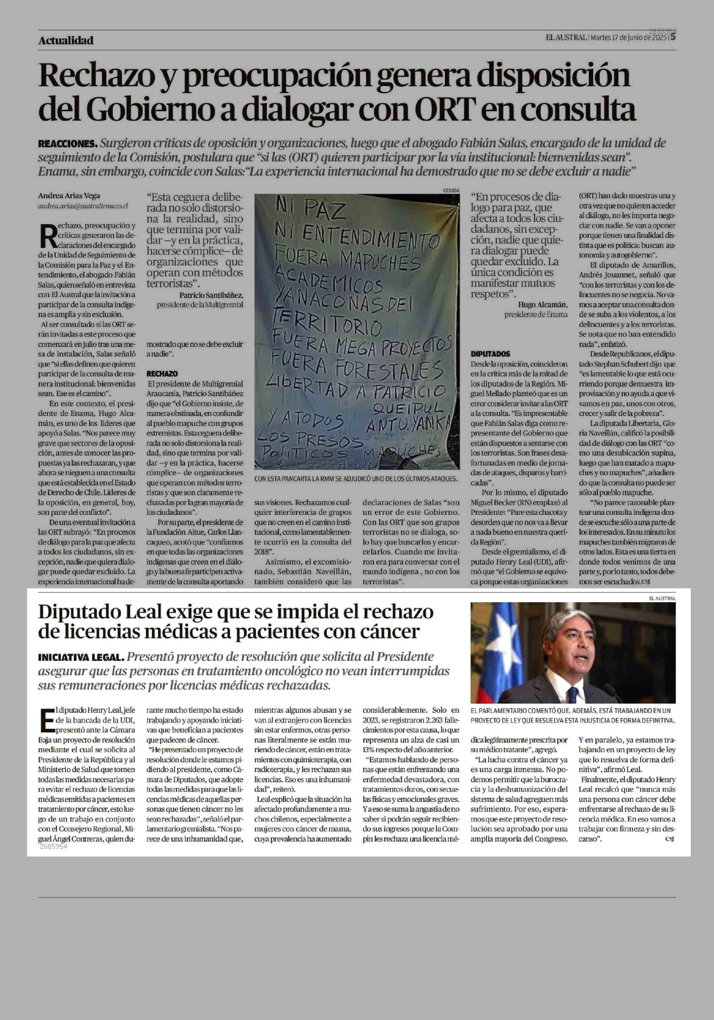 Diputado Leal exige que se impida el rechazo de licencias médicas a pacientes con cáncer 17-06-2025 El Austral de la Araucanía |