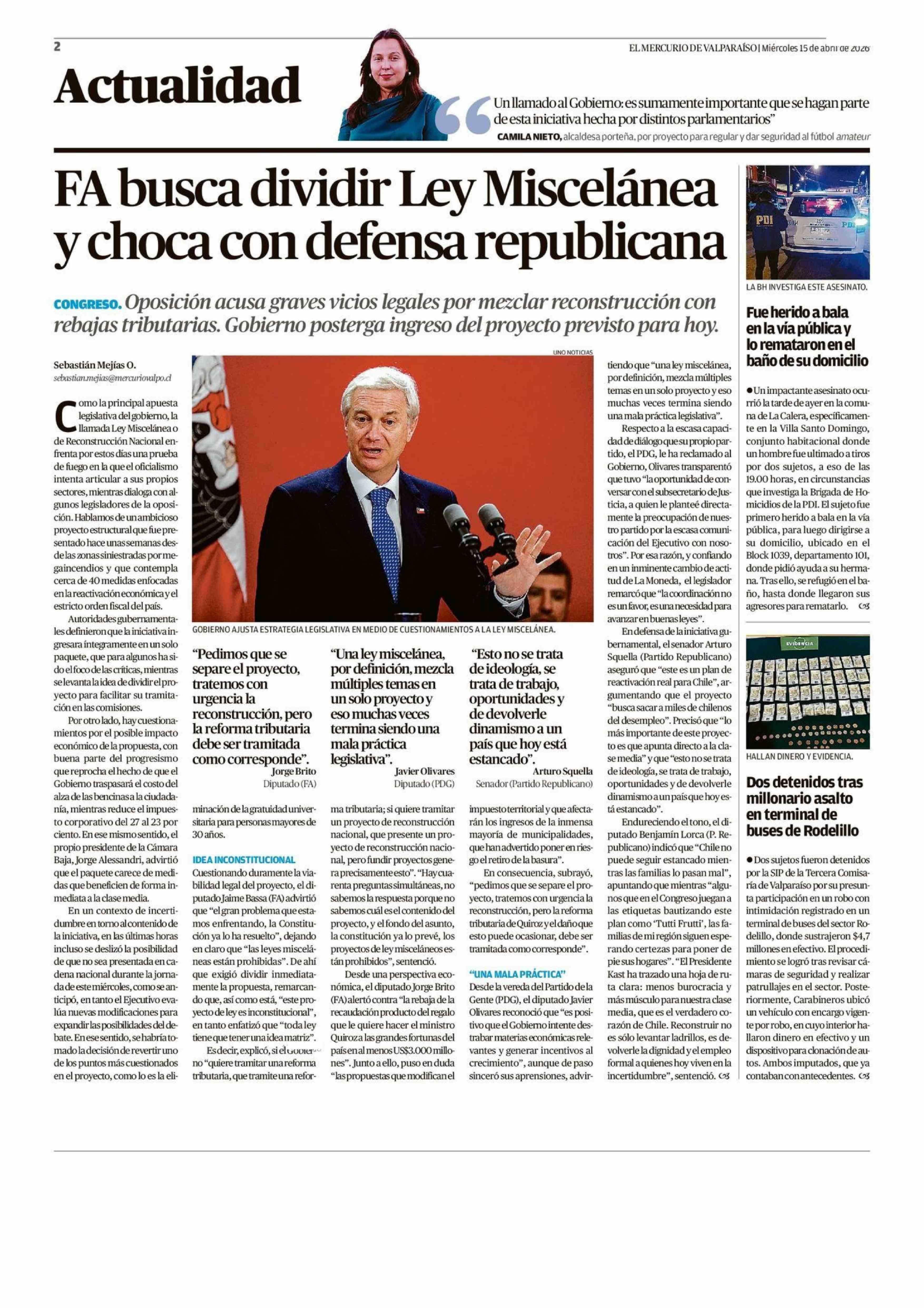 FA busca dividir Ley Miscelánea y choca con defensa republicana 15-04-2026 El Mercurio de Valparaíso |