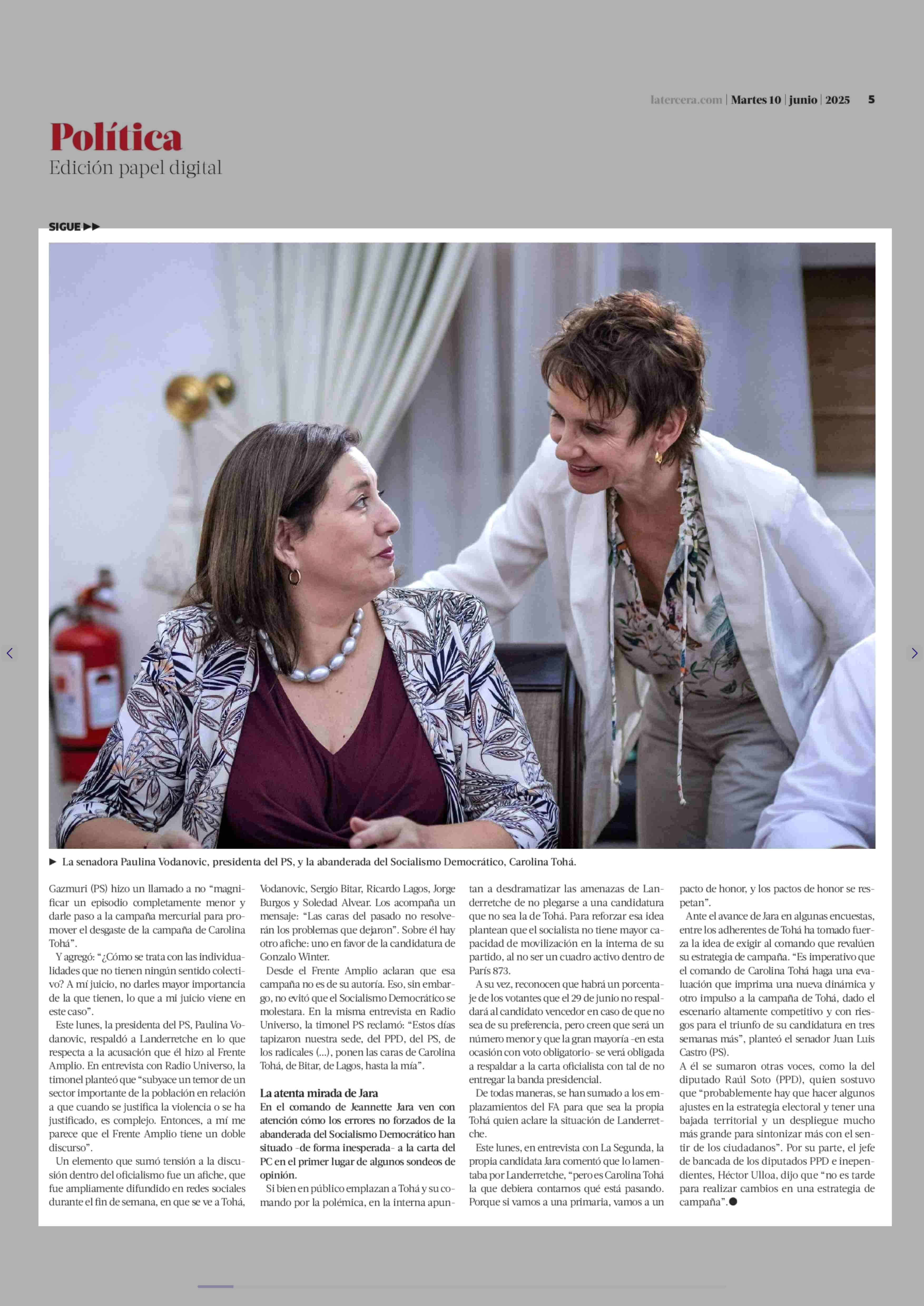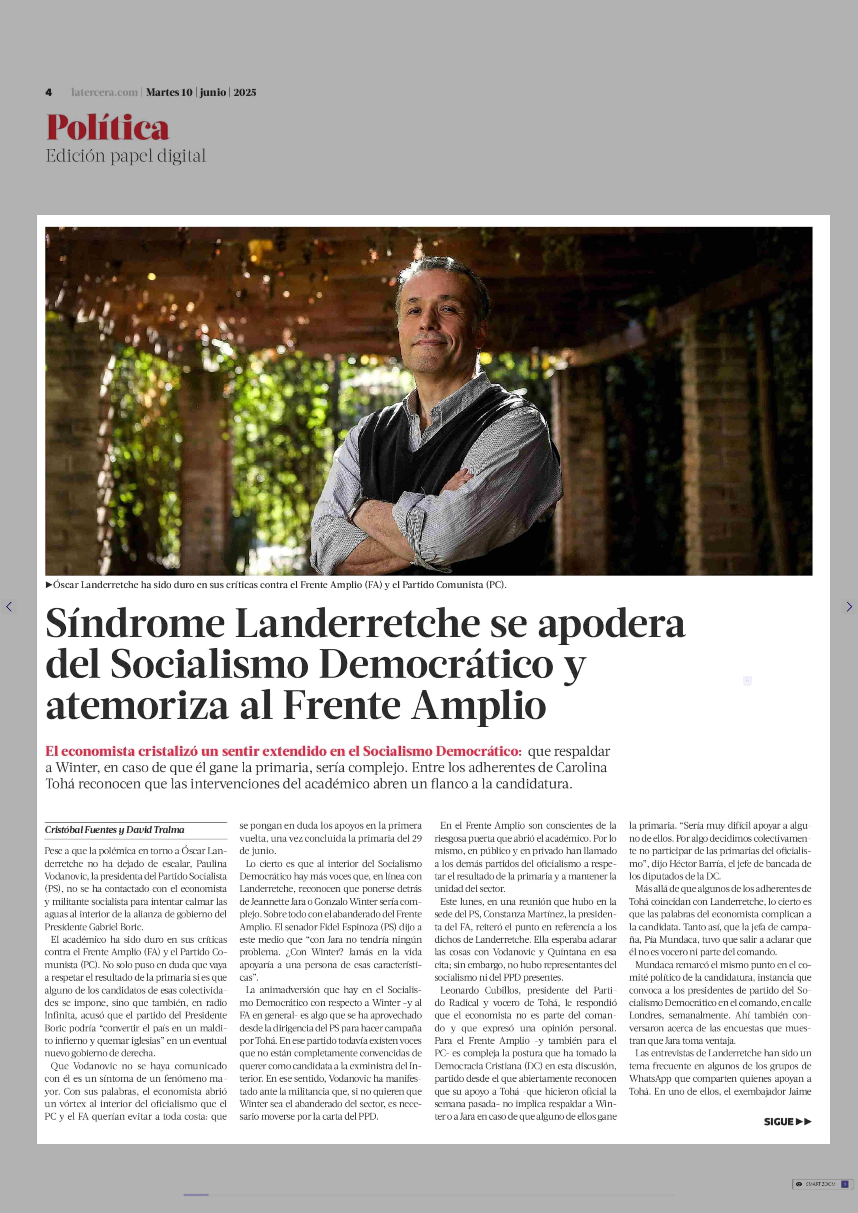 Síndrome Landerretche se apodera del Socialismo Democrático y atemoriza al Frente Amplio 10-06-2025 La Tercera |