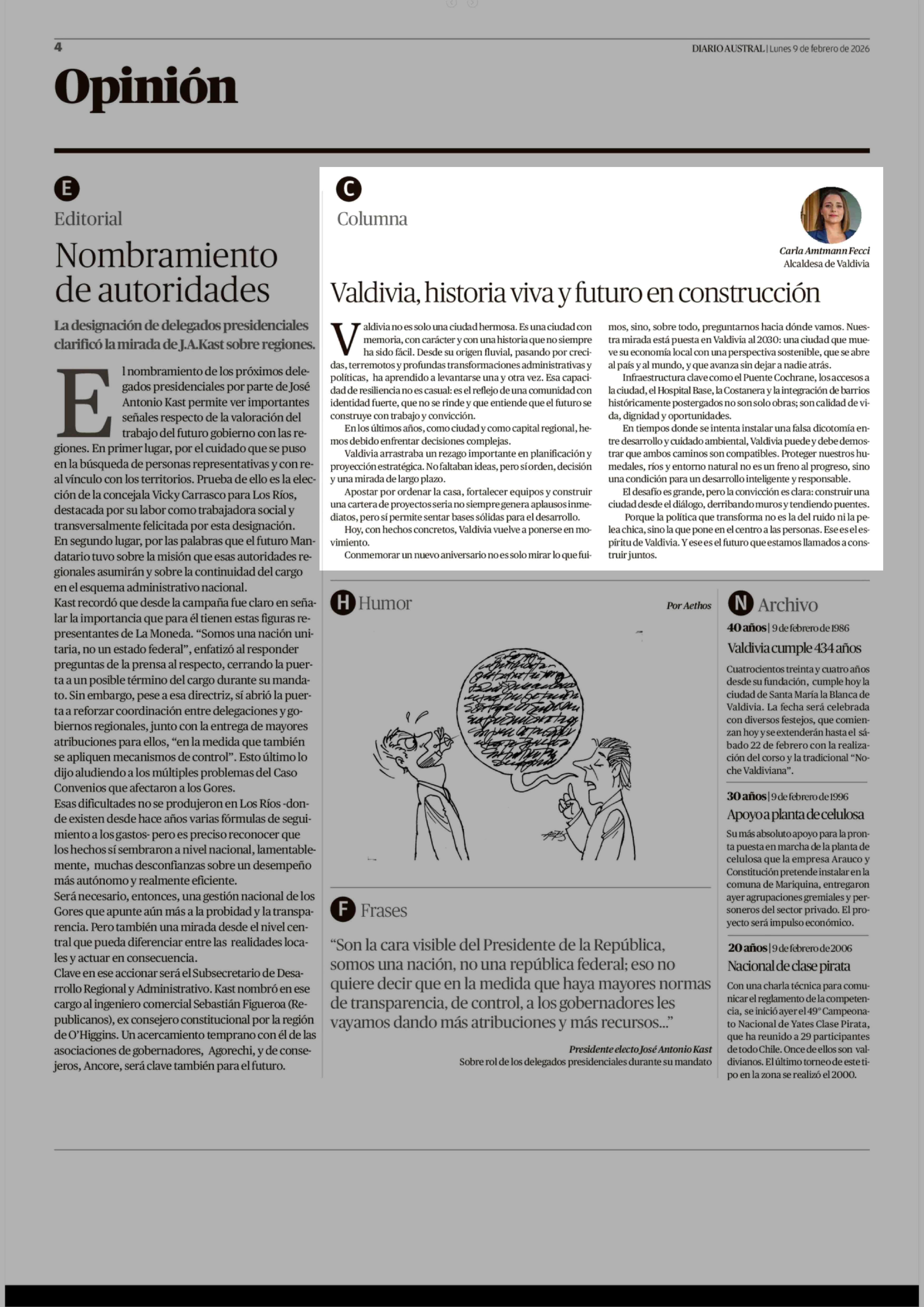 Columnas de Opinión: Valdivia, historia viva y futuro en construcción 09-02-2026 Diario Austral Región de Los Ríos |