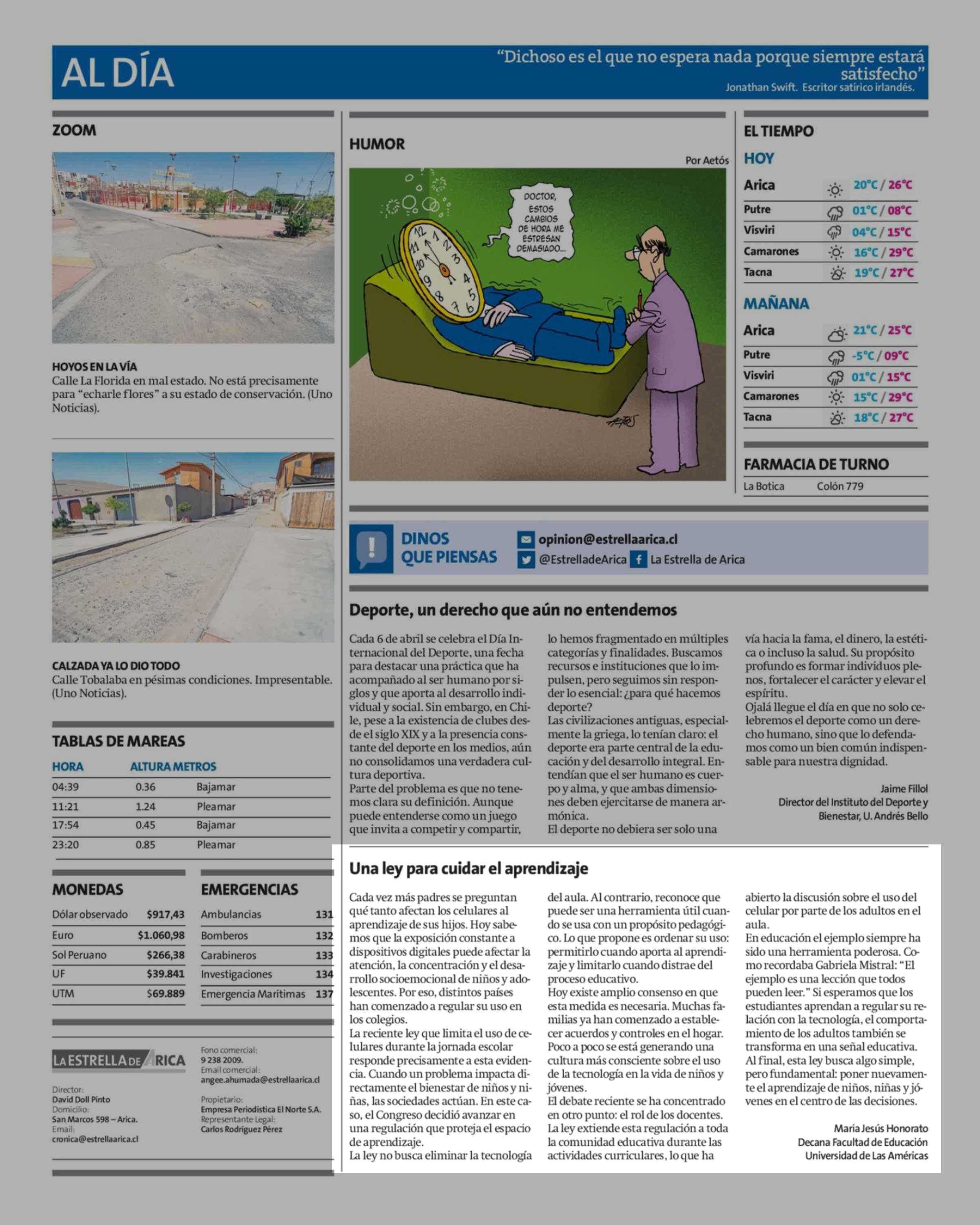 Cartas: Una ley para cuidar el aprendizaje 05-04-2026 La Estrella de Arica |