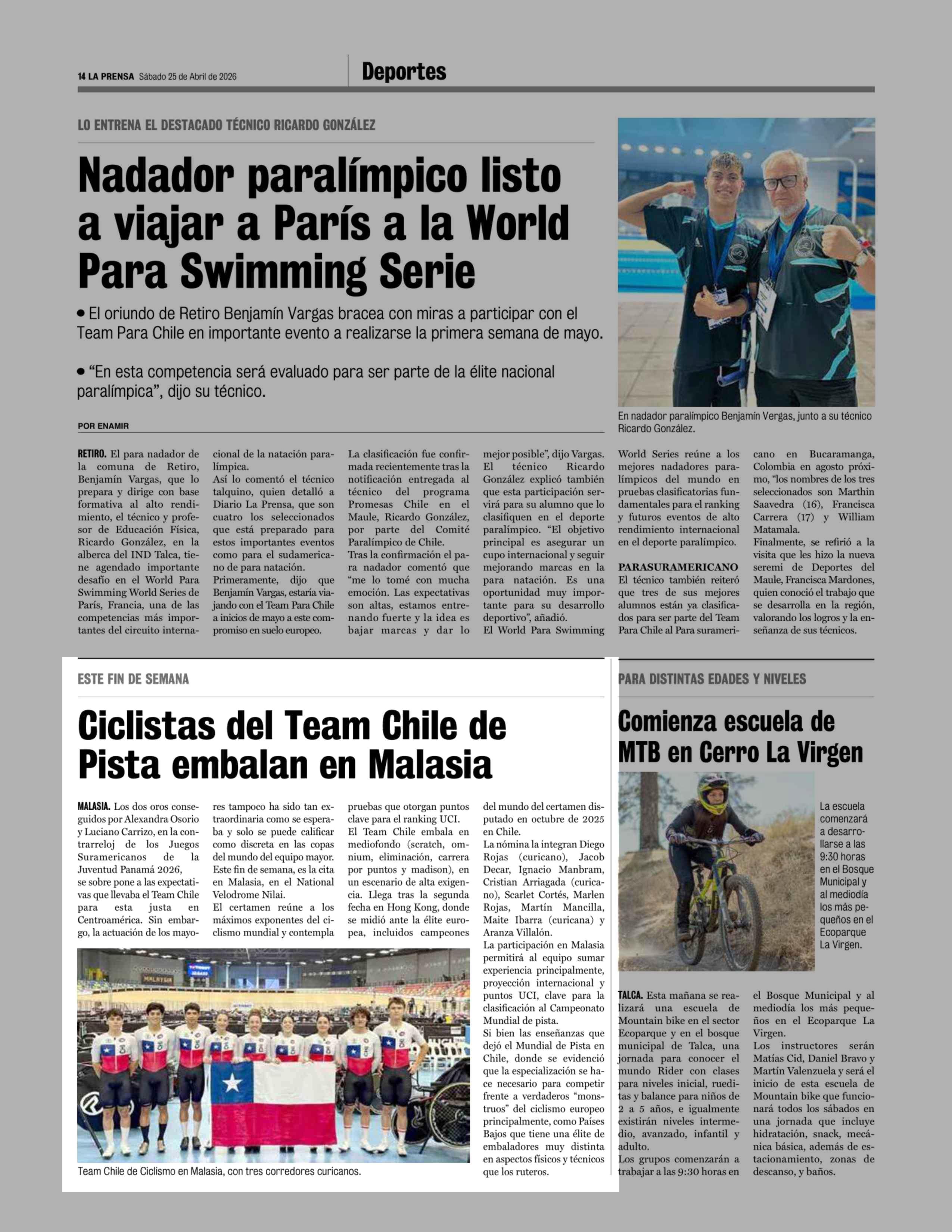 Ciclistas del Team Chile de Pista embalan en Malasia 25-04-2026 La Prensa de Curicó |