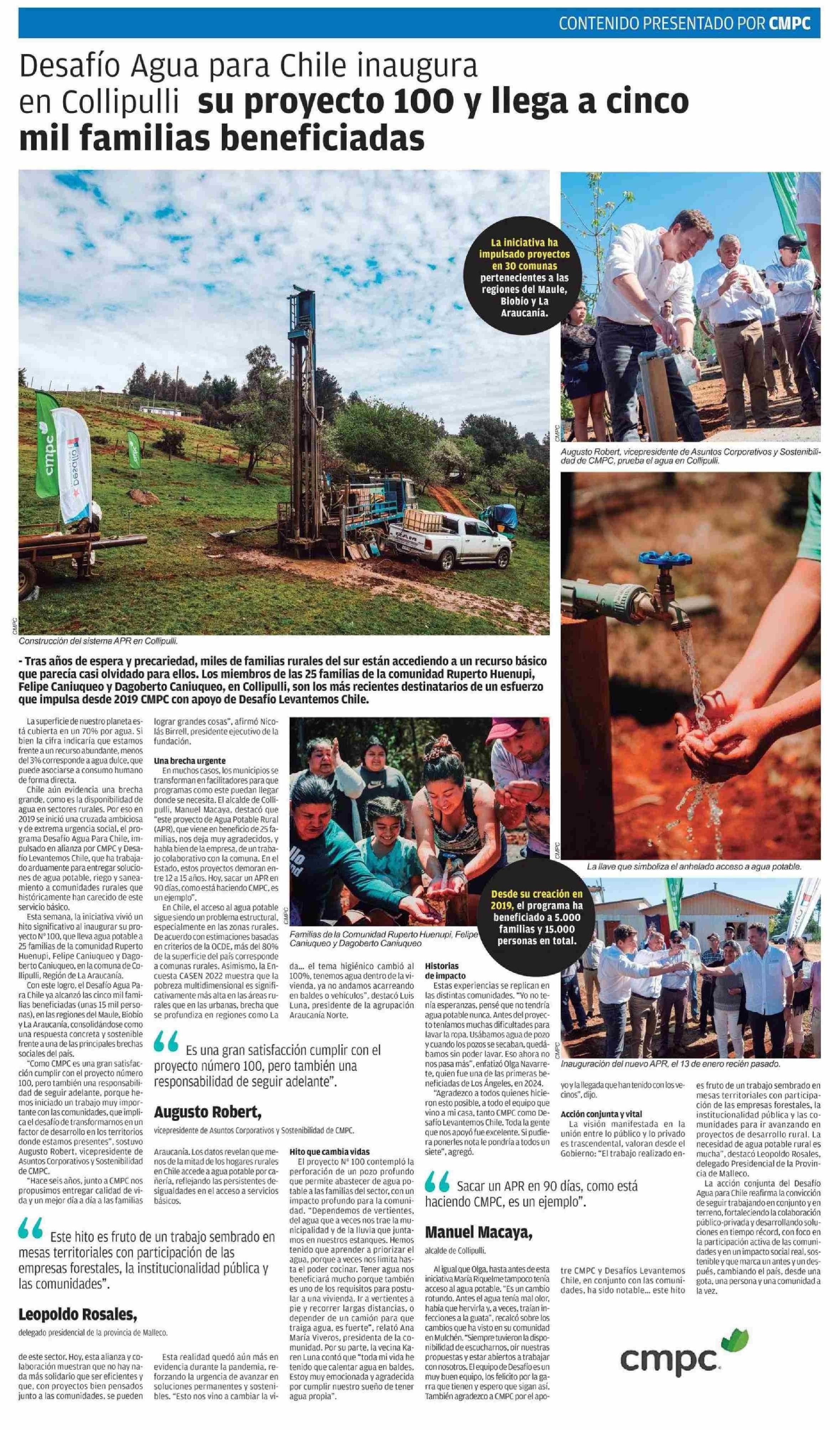 Título: Desafío Agua para Chile inaugura en Collipulli su proyecto 100 y llega a cinco mil familias beneficiadas