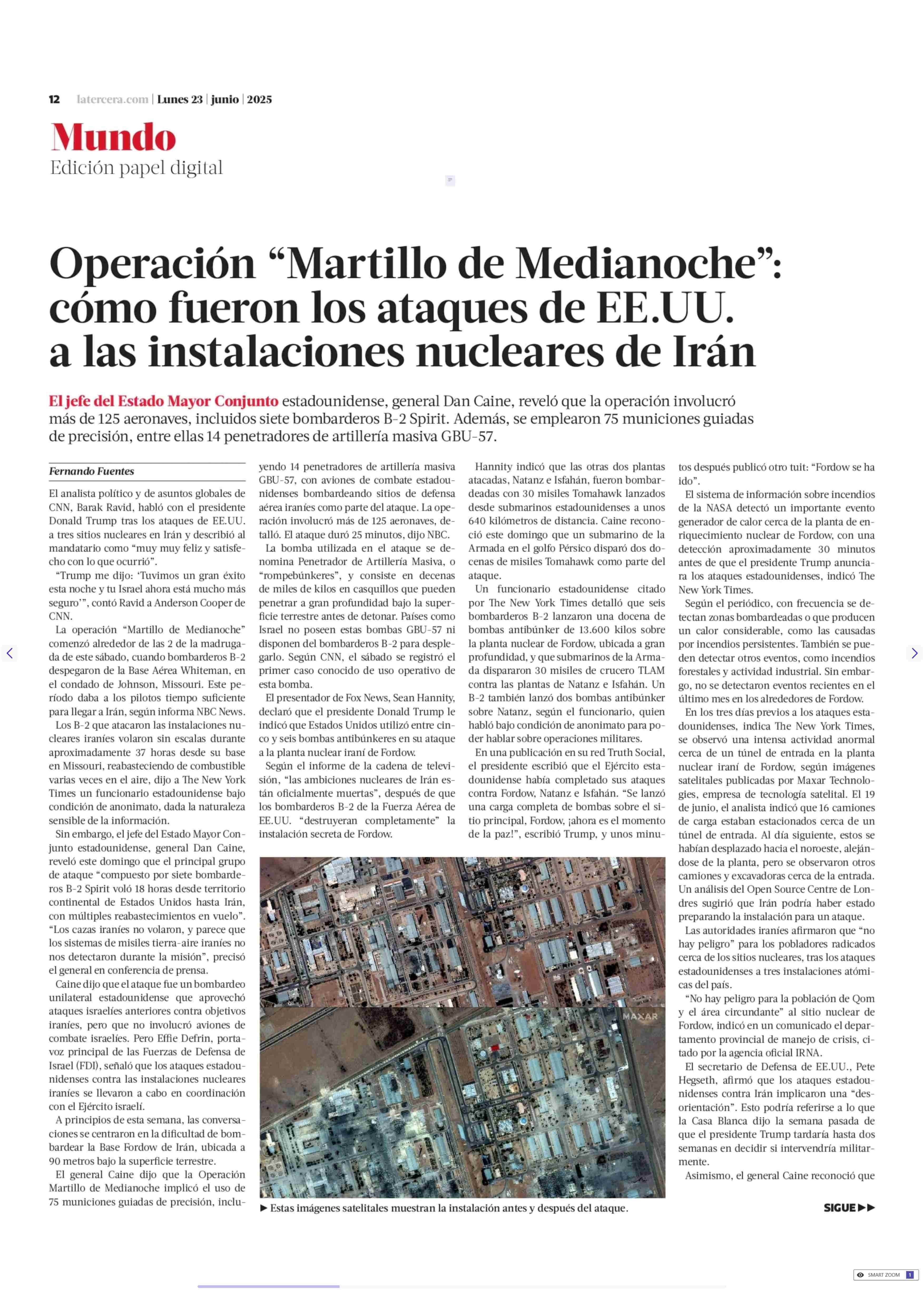 Operación “Martillo de Medianoche”: cómo fueron los ataques de EE.UU. a las instalaciones nucleares de Irán 23-06-2025 La Tercera |