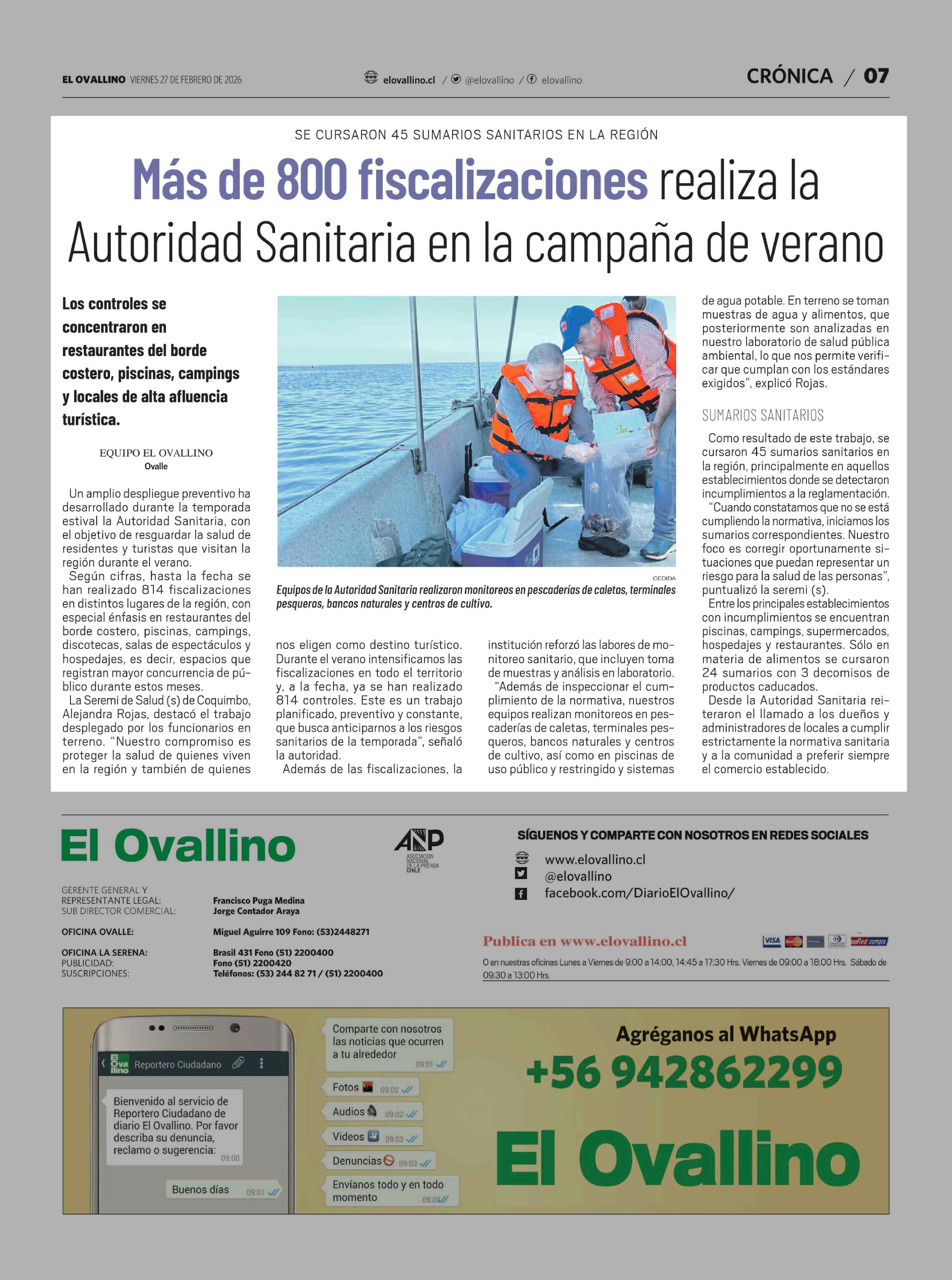 Título: Más de 800 fiscalizaciones realiza la Autoridad Sanitaria en la campaña de verano
