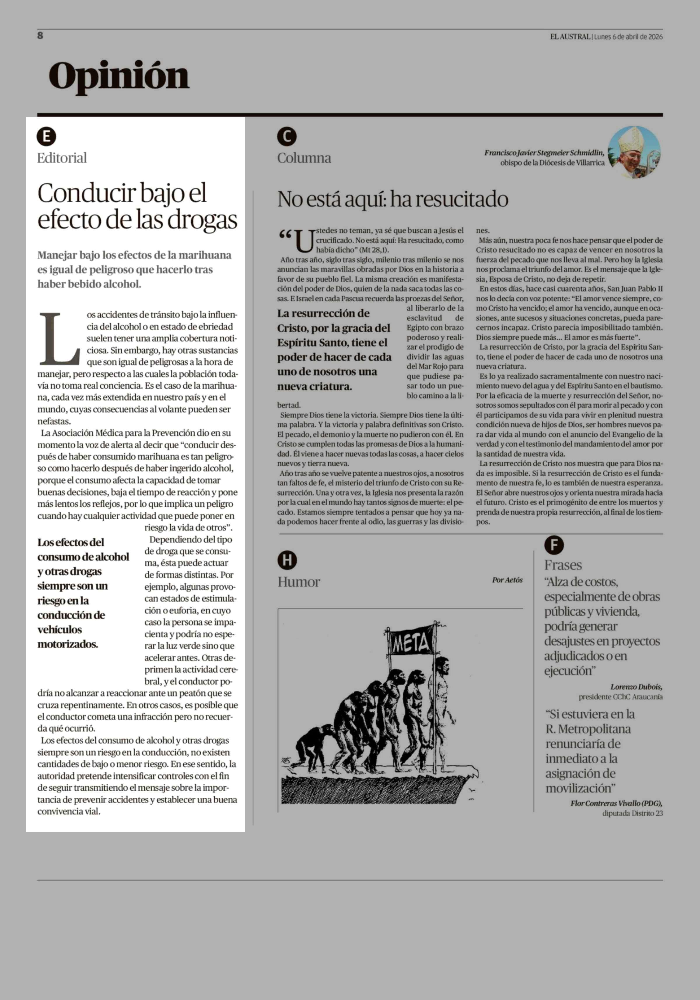Editorial: Conducir bajo el efecto de las drogas 06-04-2026 El Austral de la Araucanía |