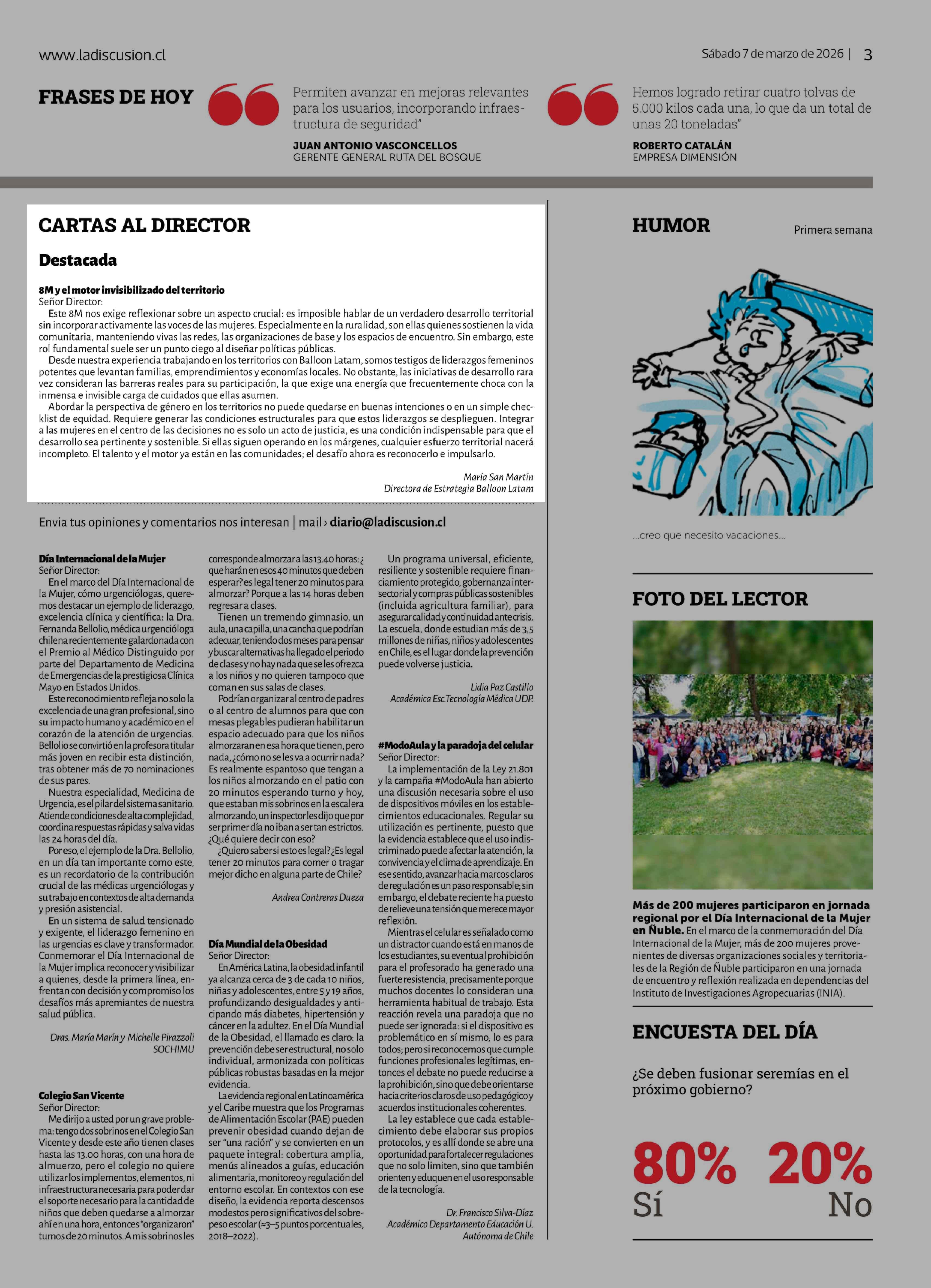 Título: Cartas: 8M y el motor invisibilizado del territorio Señor Director: Este 8M nos exige reflexionar sobre un aspecto crucial: es imposible hablar de un verdadero desarrollo territorial sin incorporar activamente las voces de las mujeres. Especialmente en la ruralidad, son ellas quienes sostienen la vi
