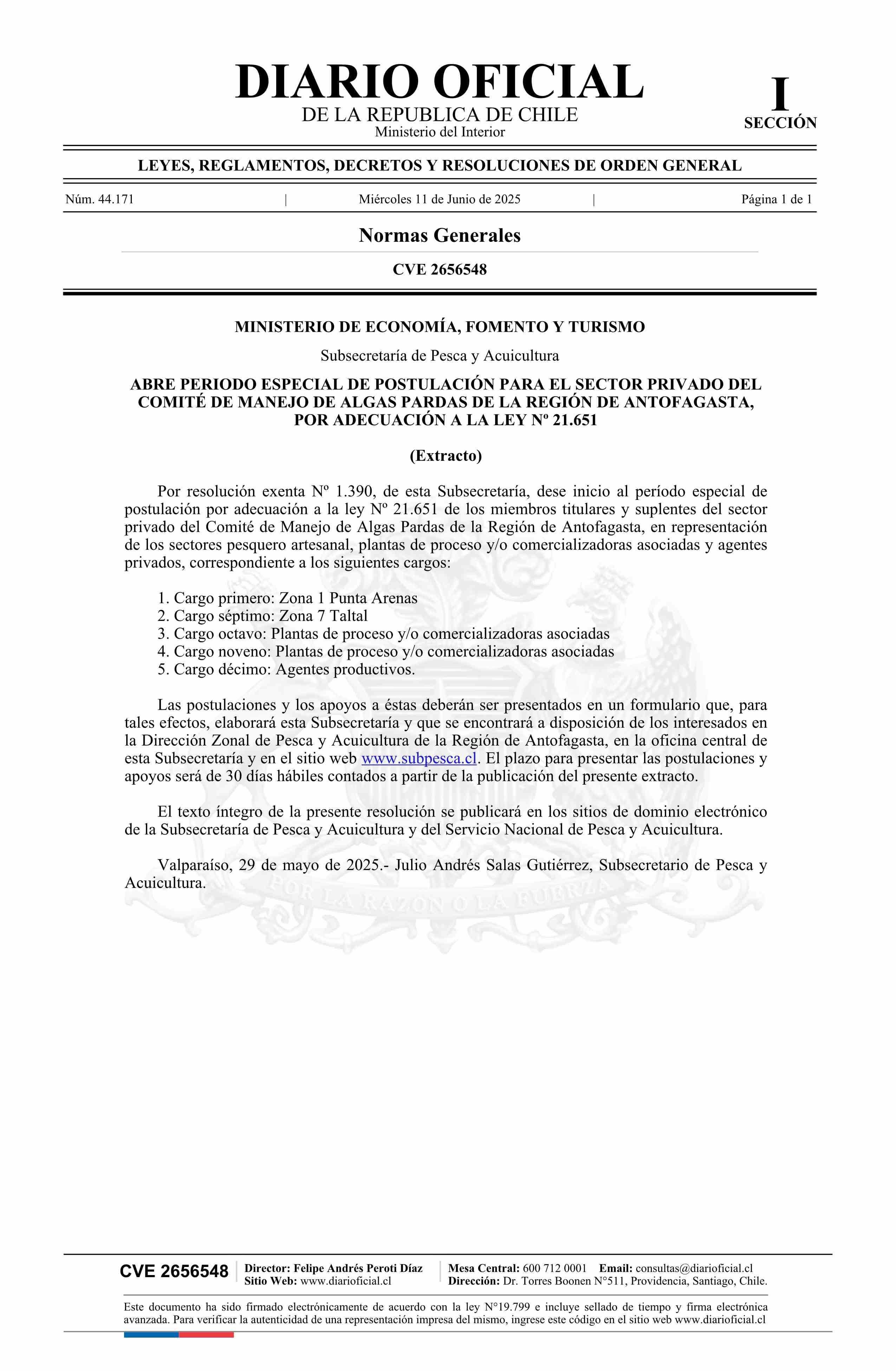 | Título: | Extracto de resolución exenta número 1.390, de 2025.- Abre periodo especial de postulación para el sector privado del Comité de Manejo de Algas Pardas de la Región de Antofagasta, por adecuación a la ley Nº 21.651 |