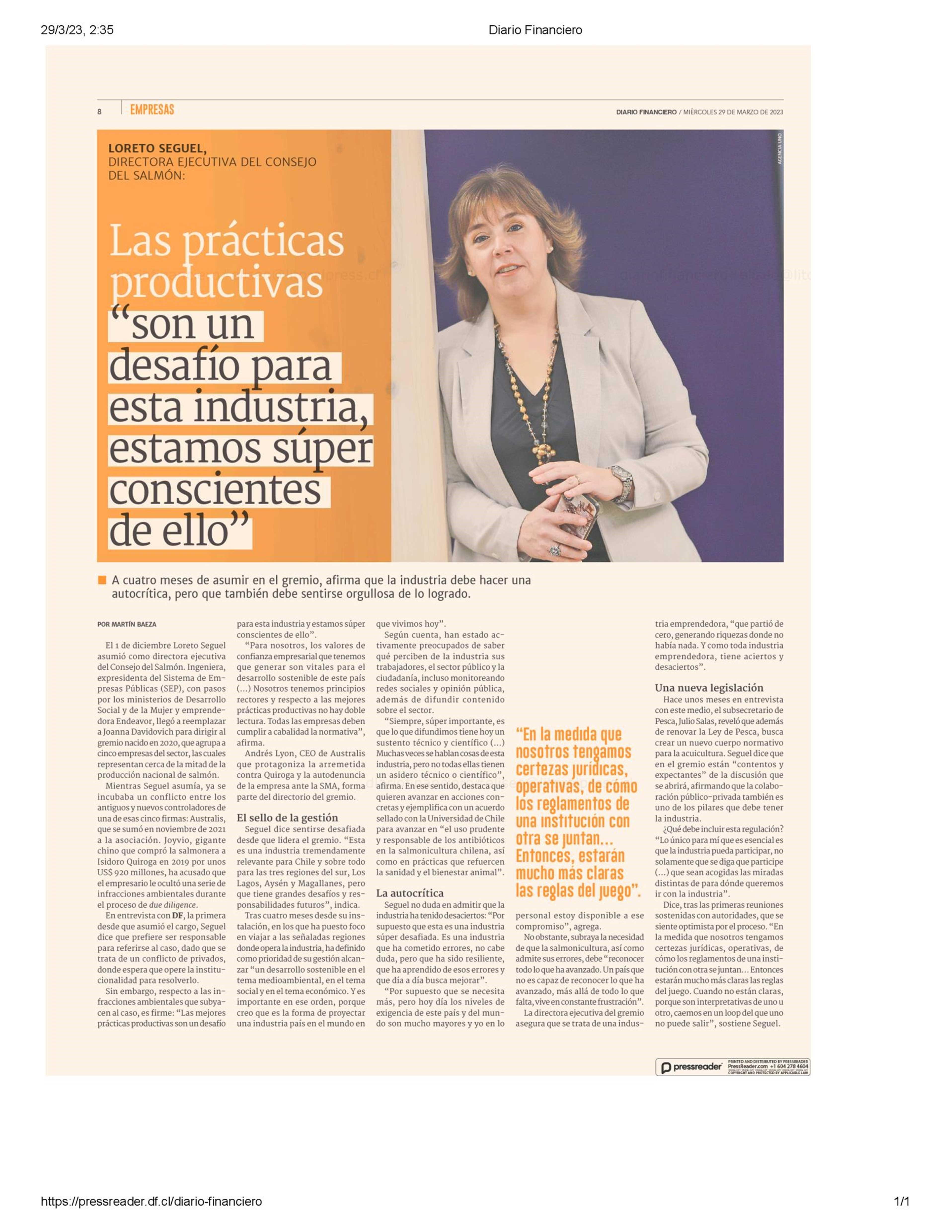 Las prácticas productivas "son un desafío para esta industria, estamos super conscientes de ello" 29-03-2023 Diario Financiero |