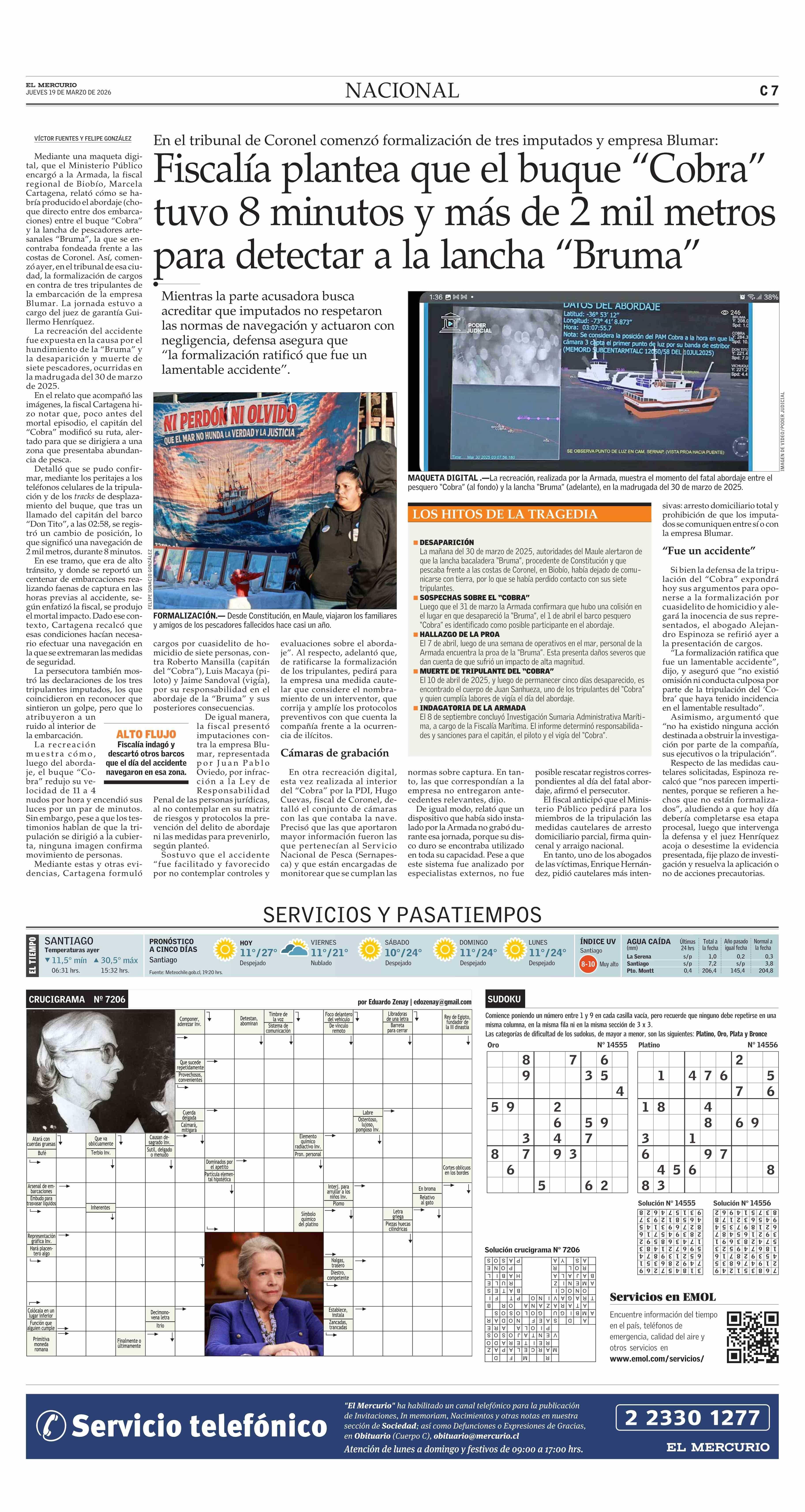 Fiscalía plantea que el buque “Cobra” tuvo 8 minutos y más de 2 mil metros para detectar a la lancha “Bruma” 19-03-2026 El Mercurio |