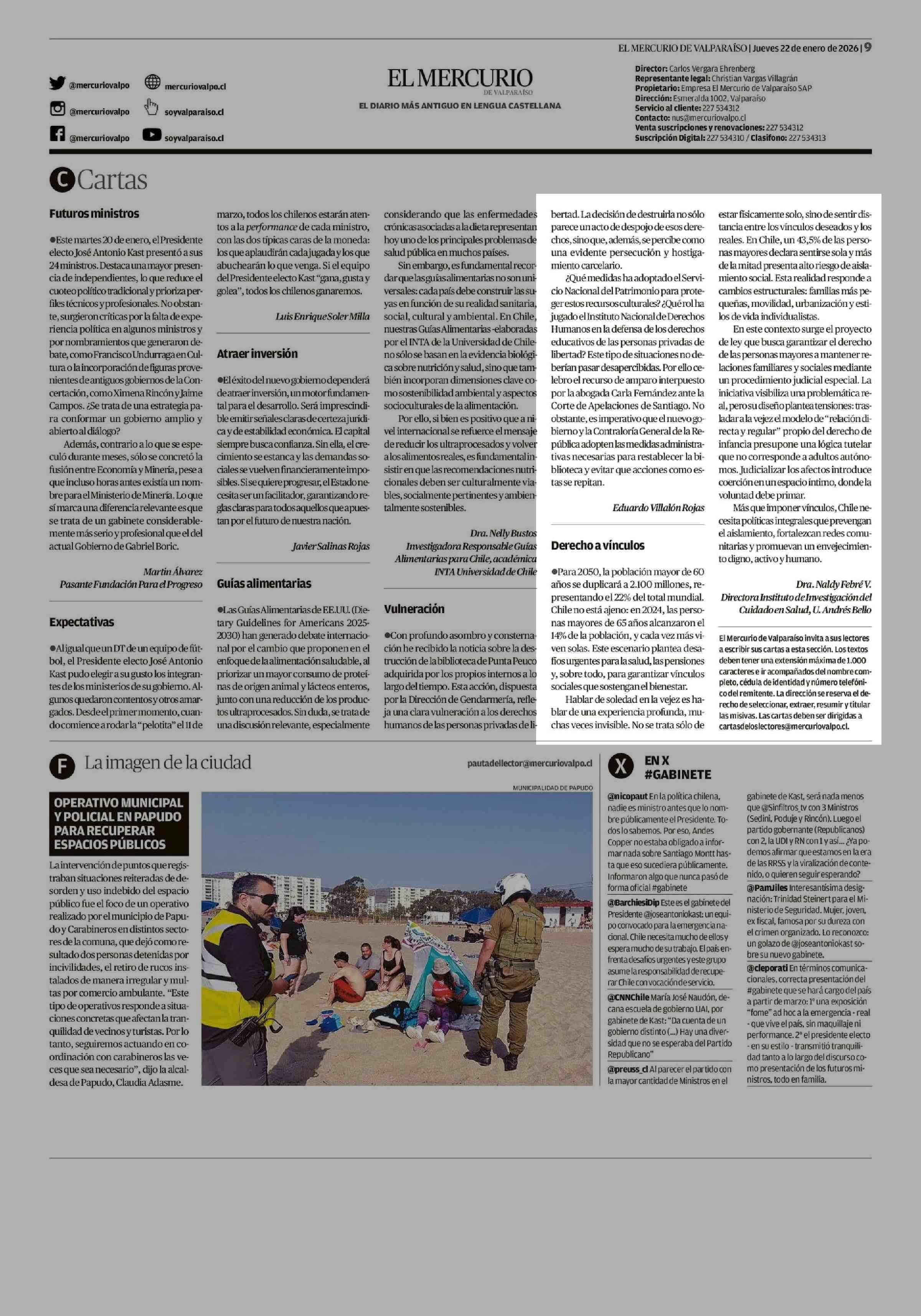 Cartas: Derecho a vínculos 22-01-2026 El Mercurio de Valparaíso |