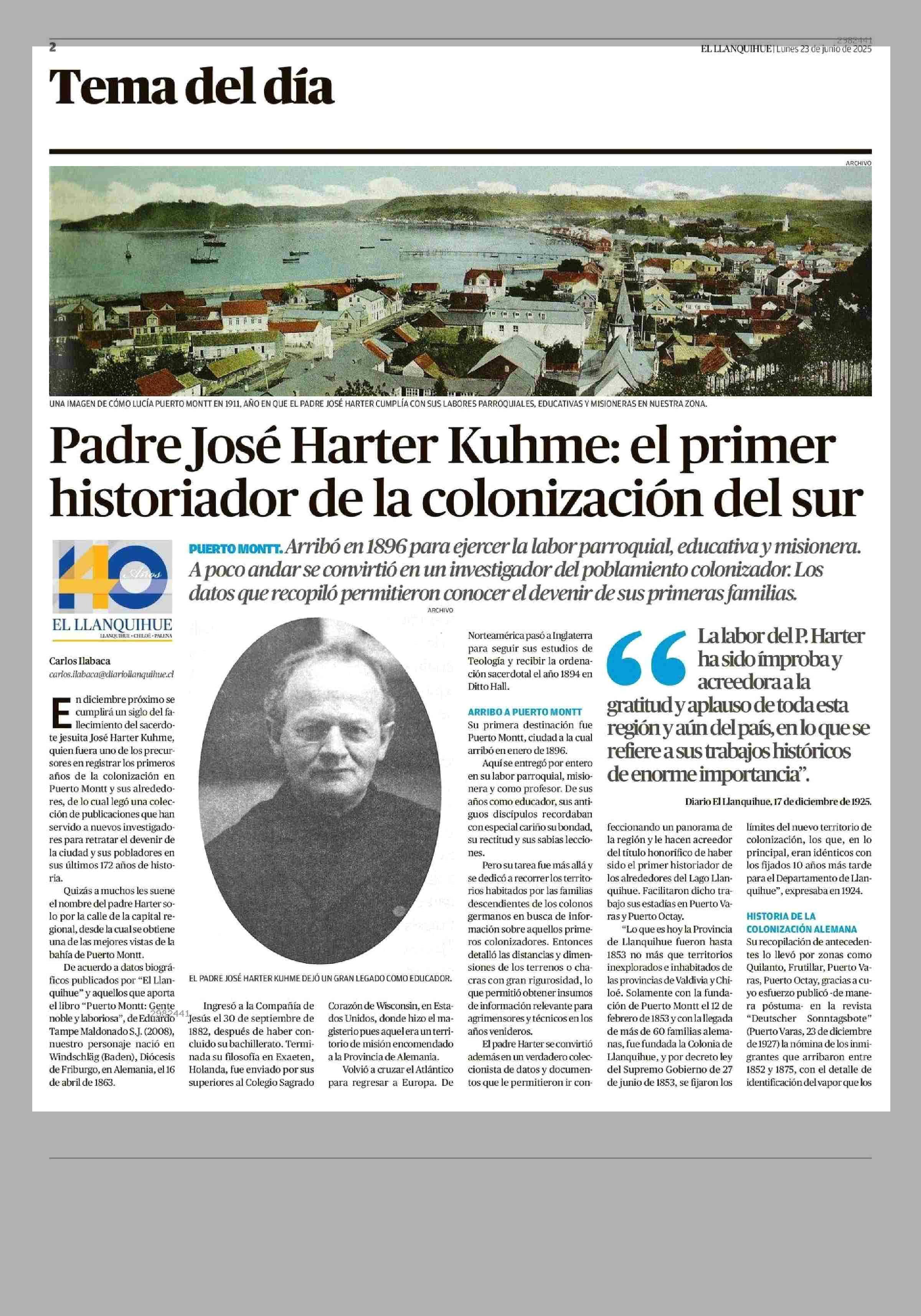Padre José Harter Kuhme: el primer historiador de la colonización del sur 23-06-2025 El Llanquihue |