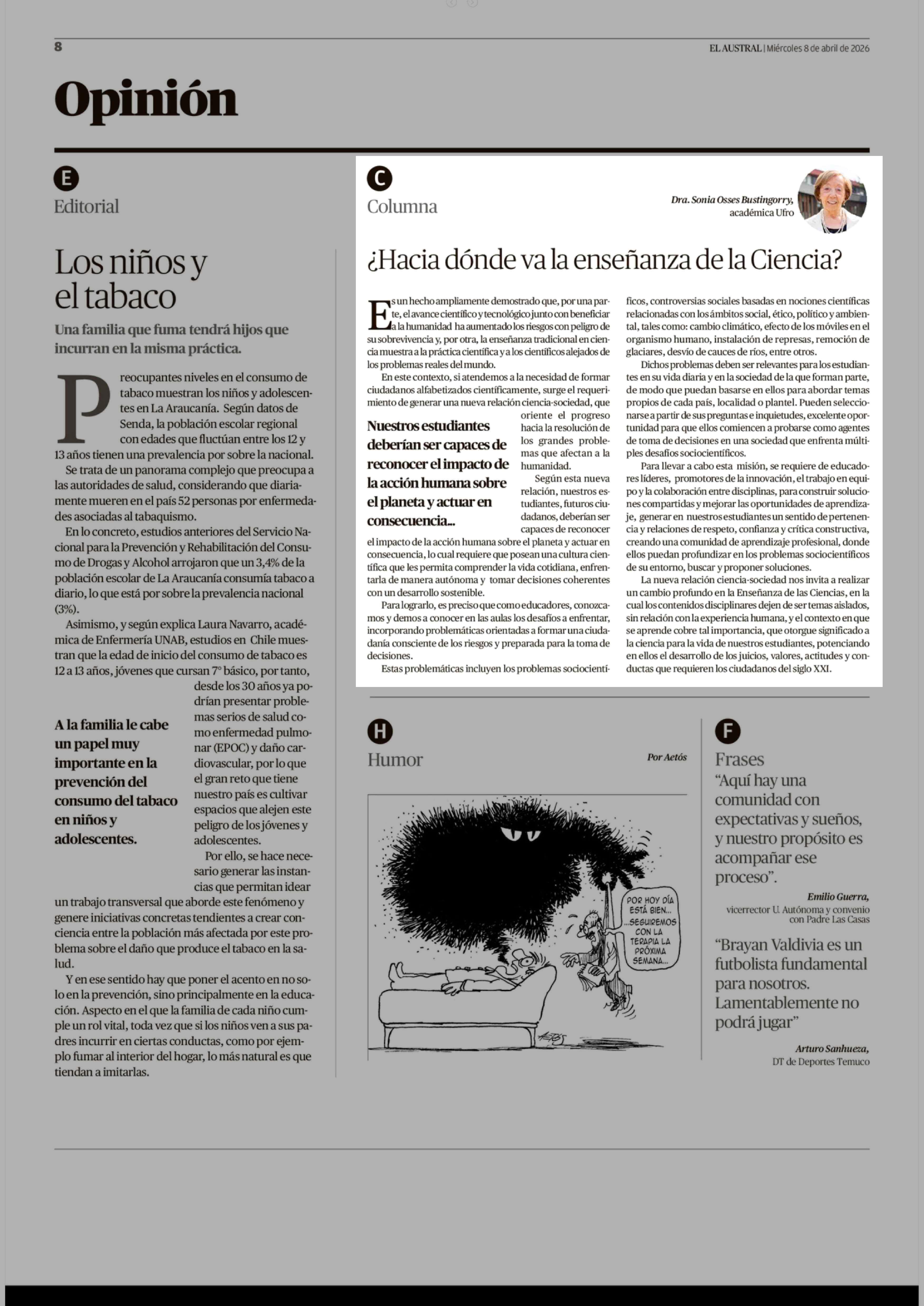 Columnas de Opinión: ¿Hacia dónde va la enseñanza de la Ciencia? 08-04-2026 El Austral de la Araucanía |