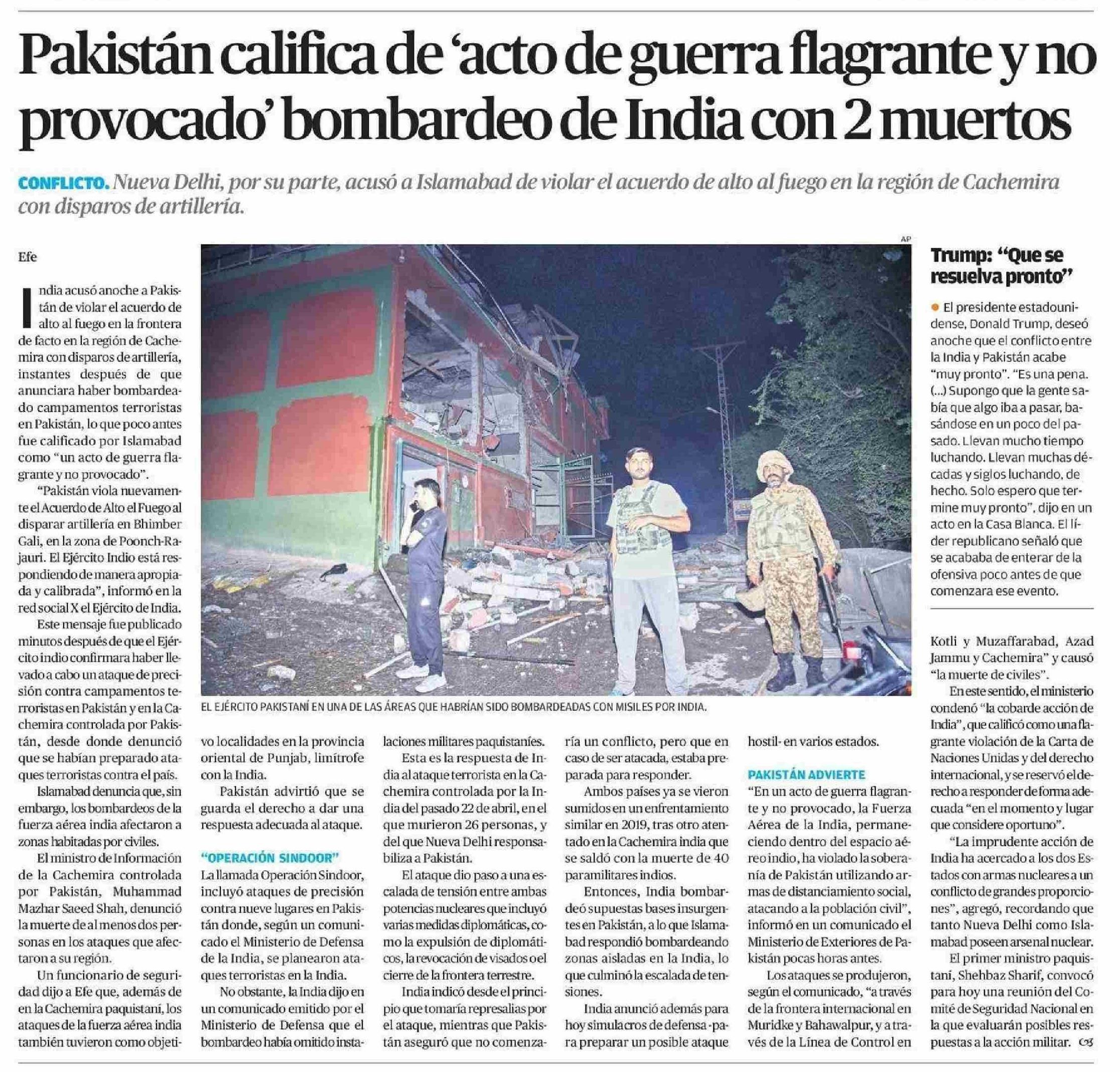 | Título: | Pakistán califica de “acto de guerra flagrante y no provocado' bombardeo de India con 2 muertos |