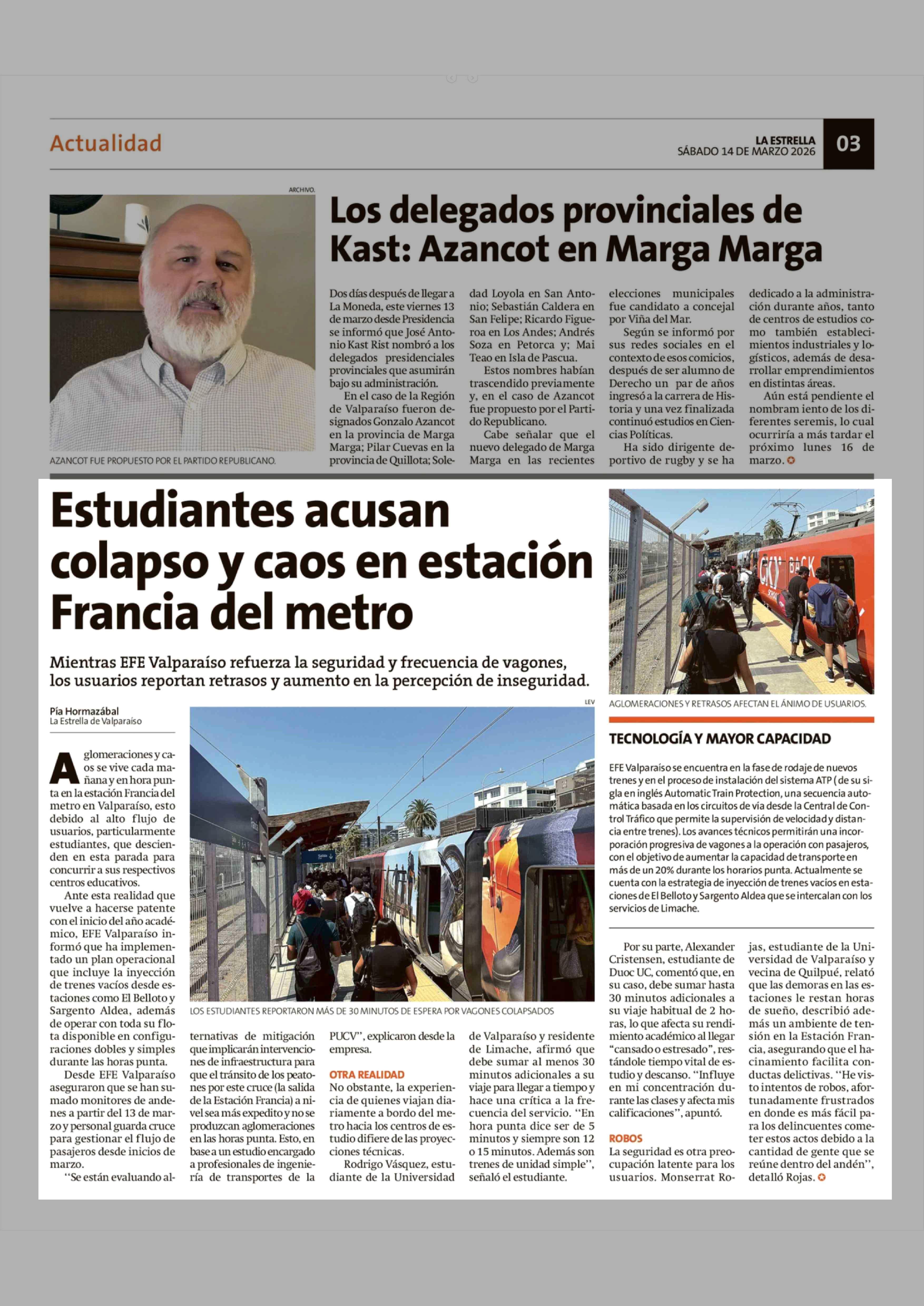 Estudiantes acusan colapso y caos en estación Francia del metro 14-03-2026 La Estrella de Valparaíso |