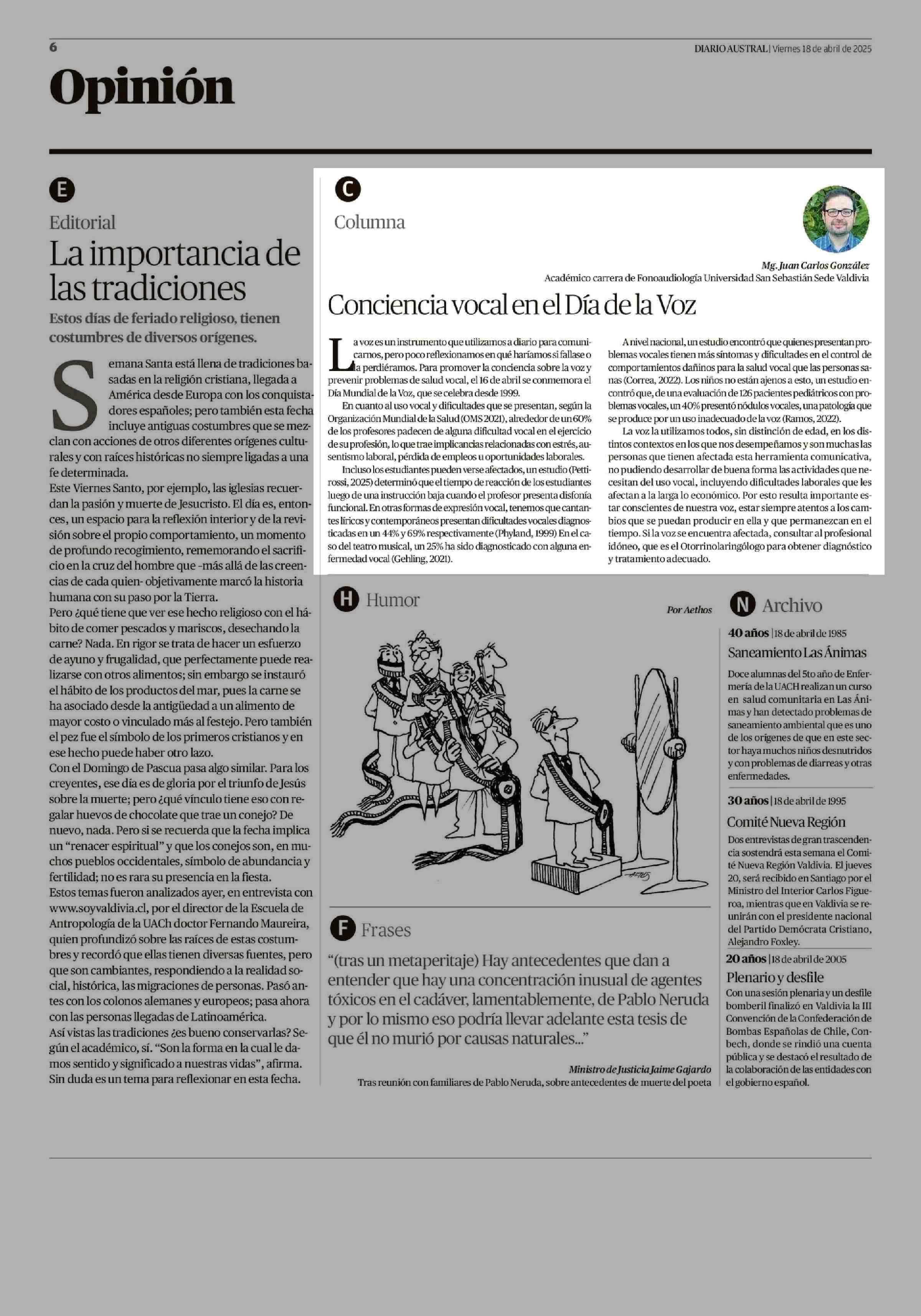 Columnas de Opinión: Conciencia vocal en el Día de la Voz 18-04-2025 Diario Austral Región de Los Ríos |