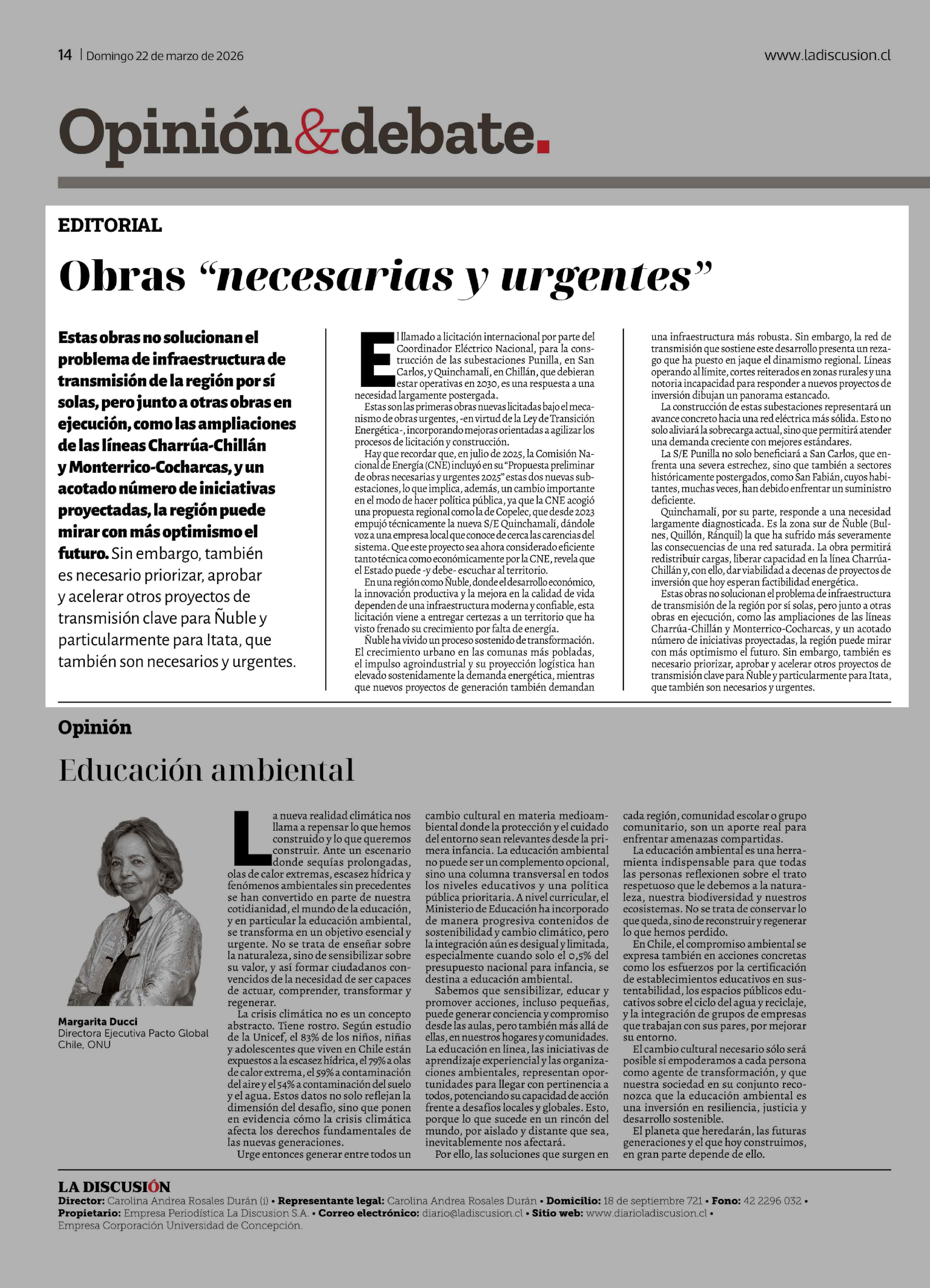 Editorial: Obras "necesarias y urgentes" 22-03-2026 La Discusión |