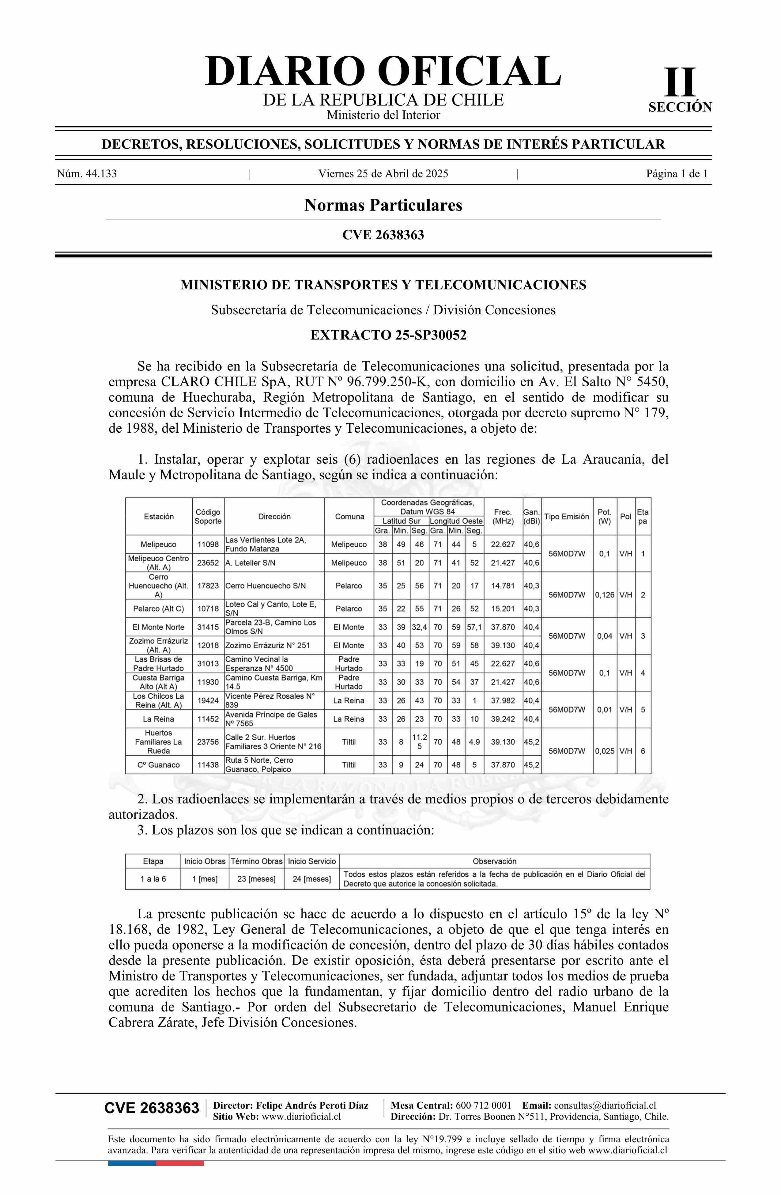 Solicitud número 25-SP30052.- Claro Chile SpA 25-04-2025 Diario Oficial Edición Electrónica |