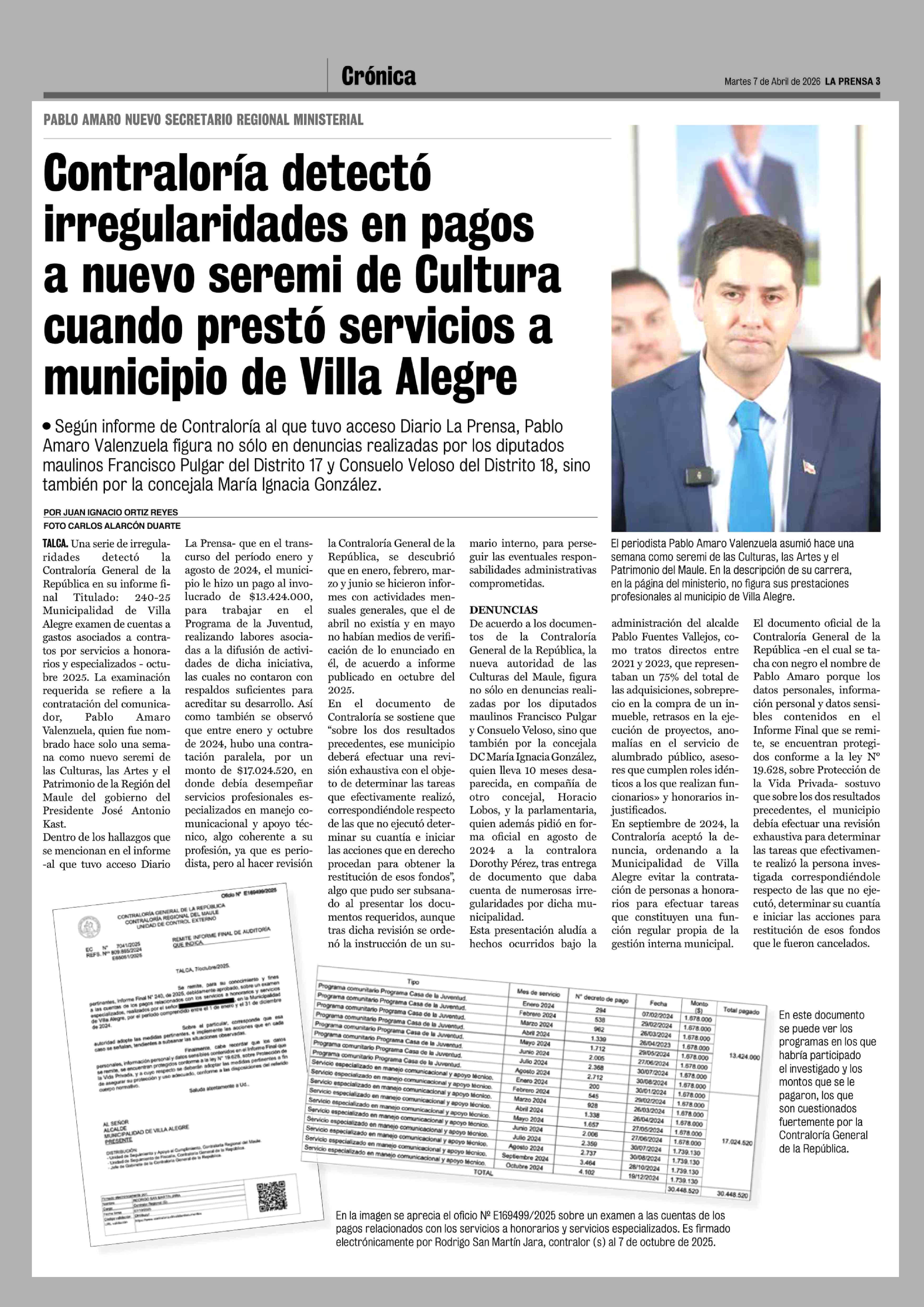 Contraloría detectó irregularidades en pagos a nuevo seremi de Cultura cuando presto servicios a municipio de Villa Alegre 07-04-2026 La Prensa de Curicó |