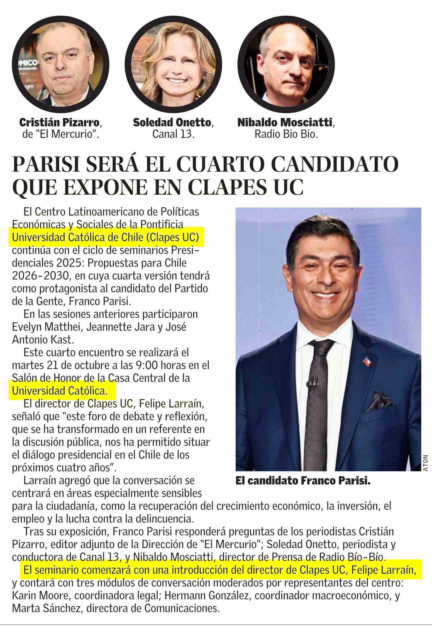 Título: PARISI SERÁ EL CUARTO CANDIDATO QUE EXPONE EN CLAPES UC