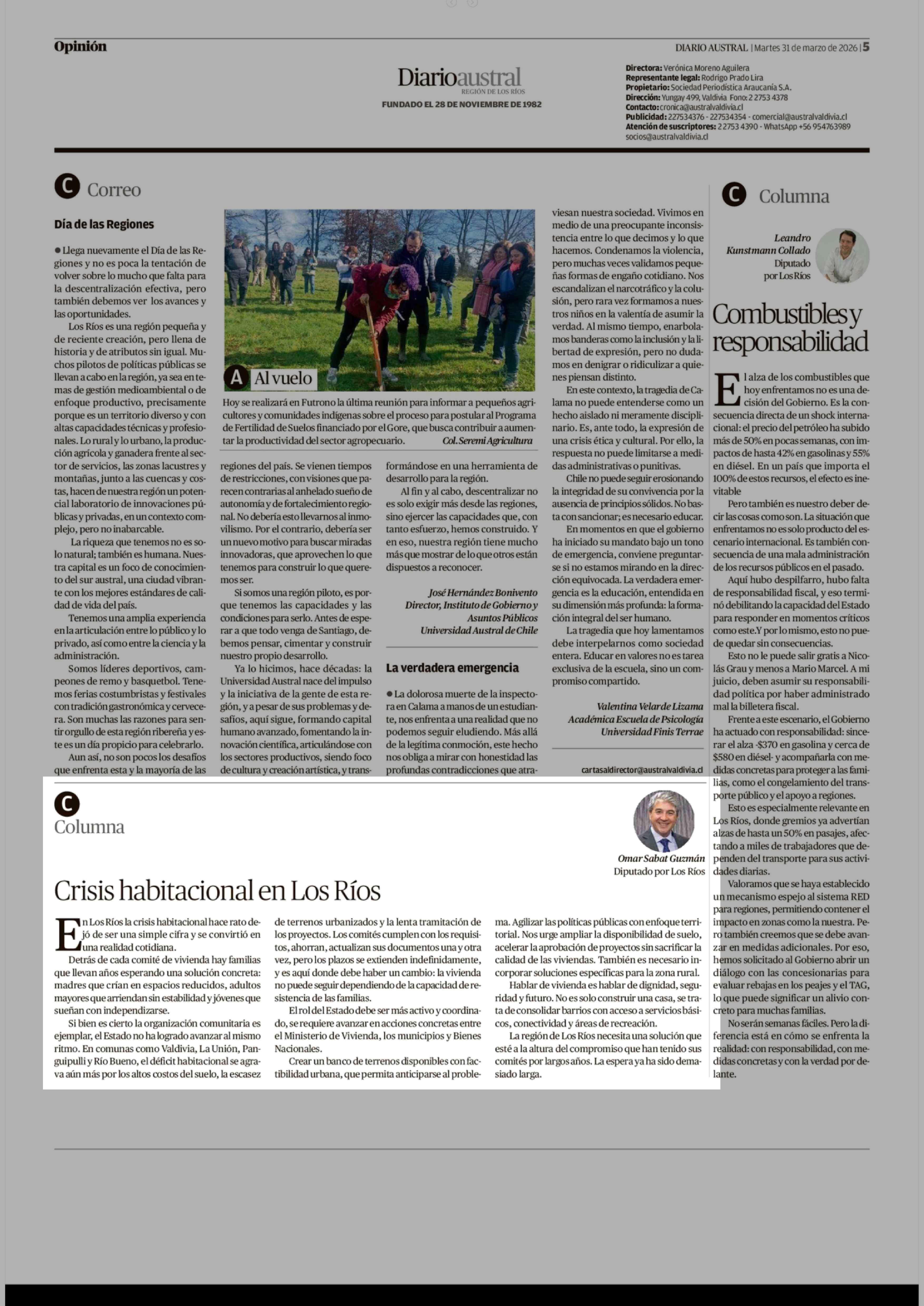 Columnas de Opinión: Crisis habitacional en Los Ríos 31-03-2026 Diario Austral Región de Los Ríos |