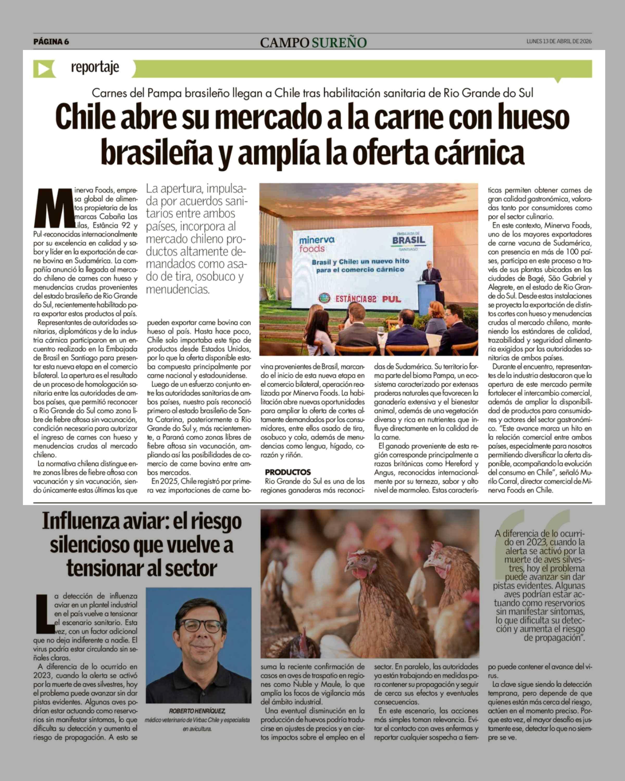 Chile abre su mercado a la carne con hueso brasileña y amplía la oferta cárnica 13-04-2026 Campo Sureño - Regiones IX, X y XIV |