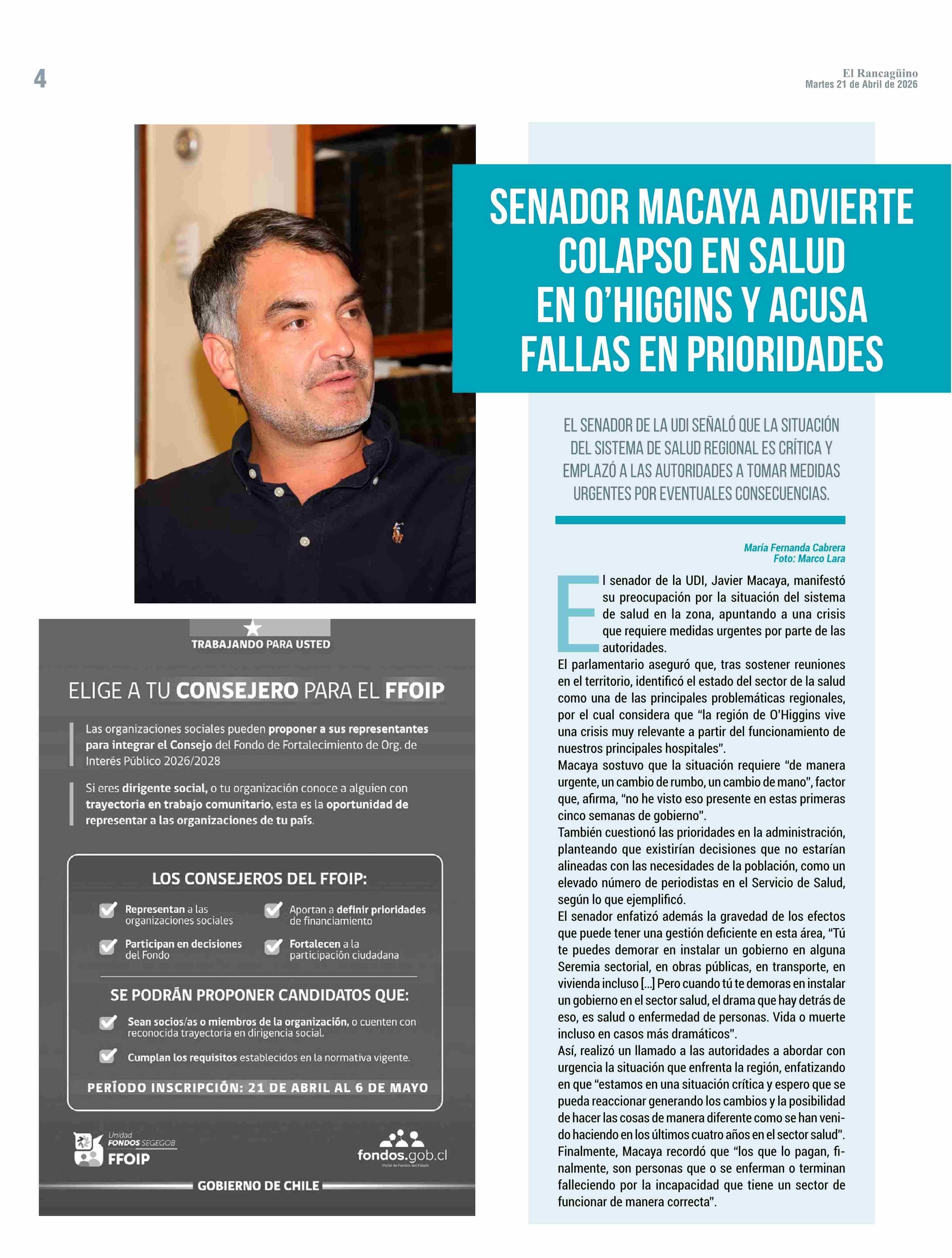 SENADOR MACAYA ADVIERTE COLAPSO EN SALUD EN O'HIGGINS Y ACUSA FALLAS EN PRIORIDADES 21-04-2026 El Rancagüino |