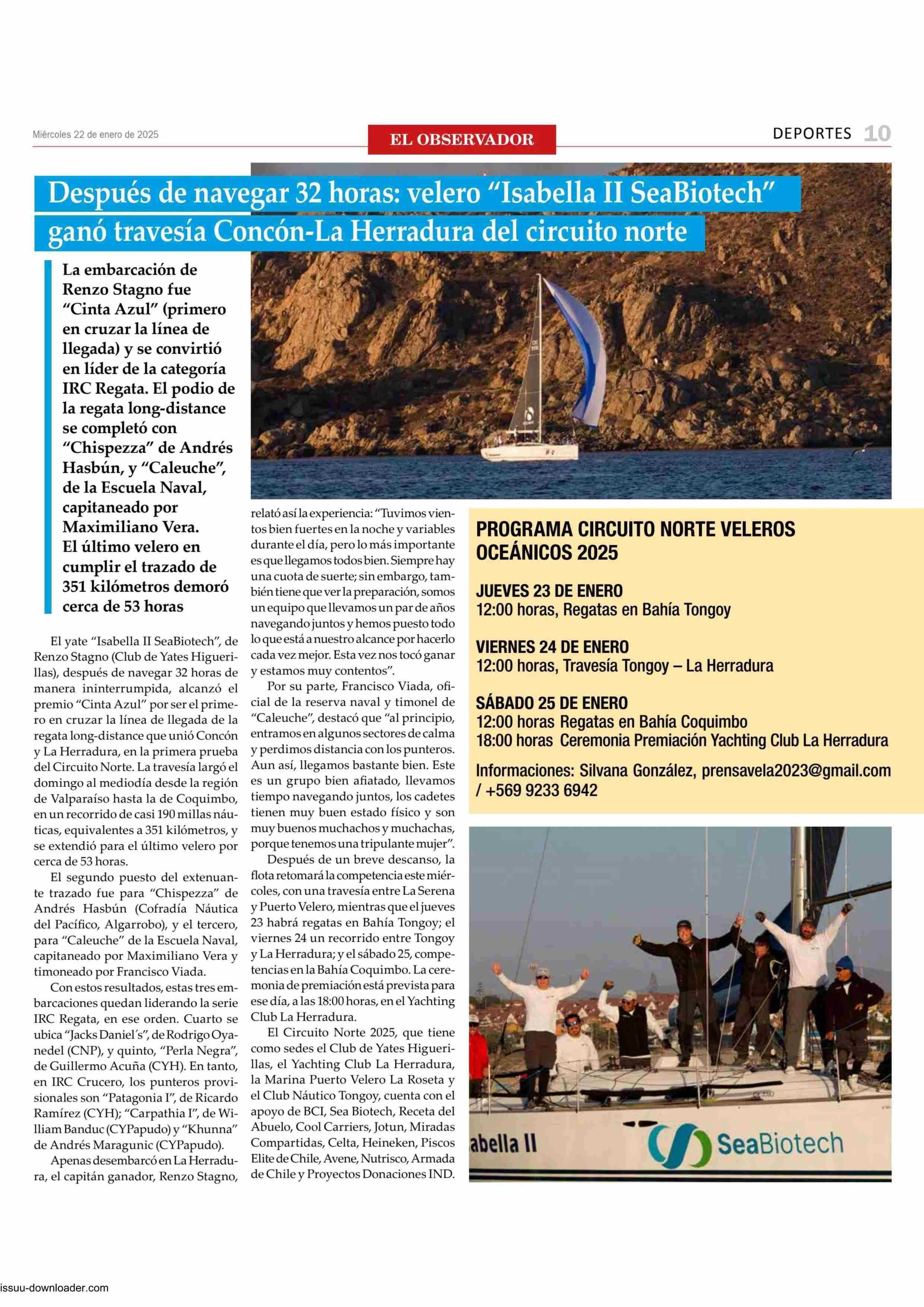 Después de navegar 32 horas: velero “Isabella II SeaBiotech” ganó travesía Concón-La Herradura del circuito norte 22-01-2025 El Observador Vespertino |