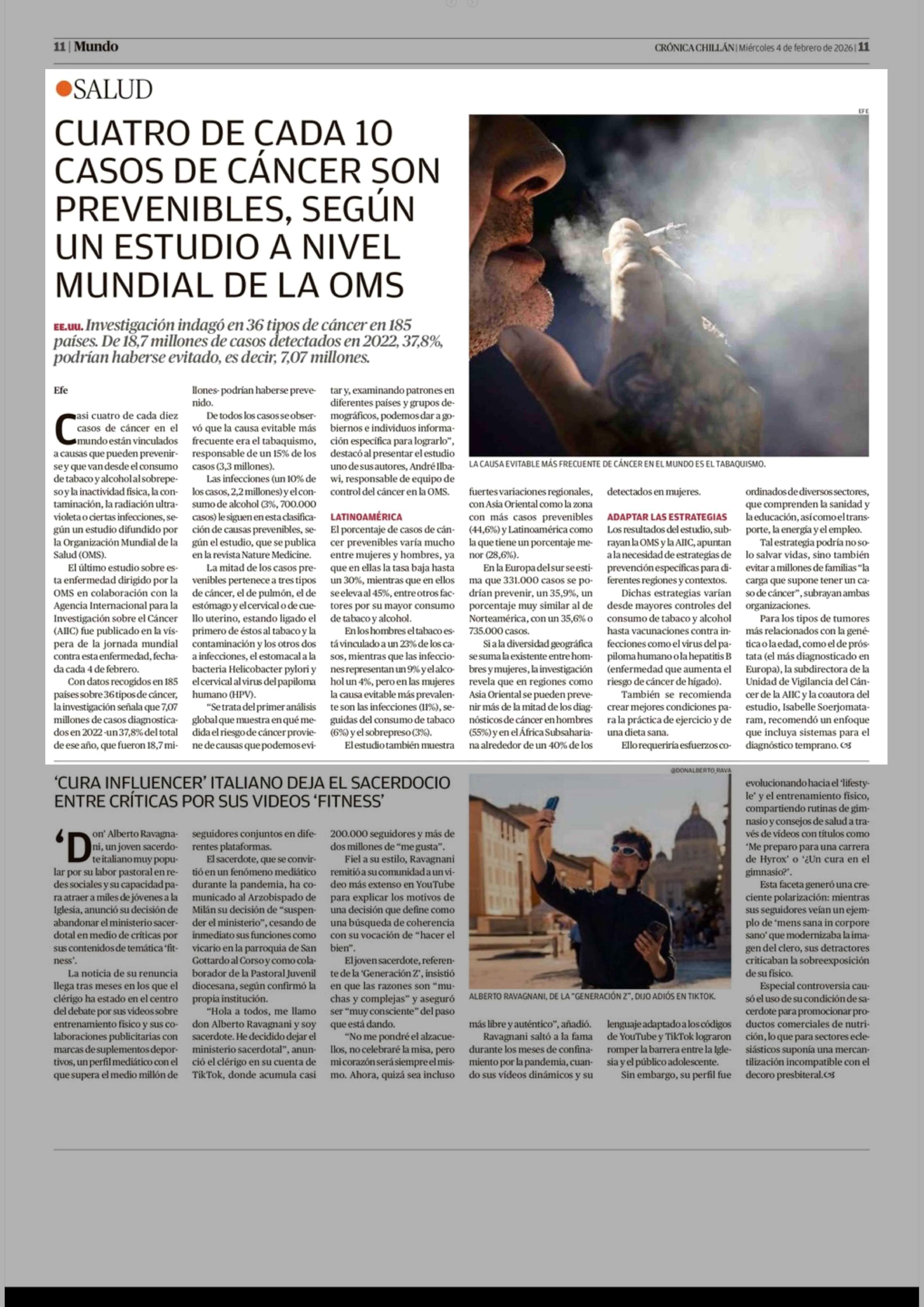 CUATRO DE CADA 10 CASOS DE CÁNCER SON PREVENIBLES, SEGÚN UN ESTUDIO A NIVEL MUNDIAL DE LA OMS 04-02-2026 Crónica de Chillán |