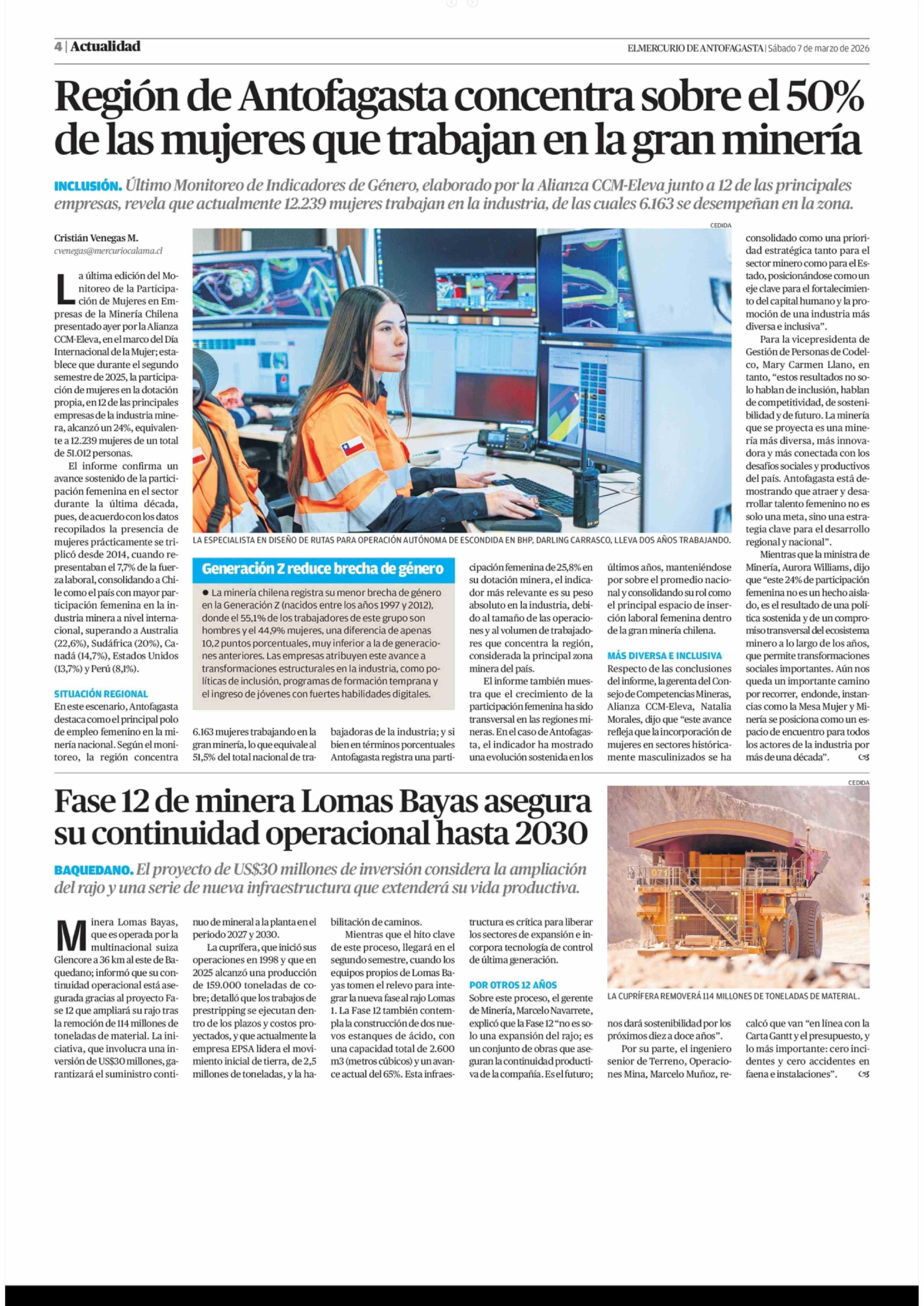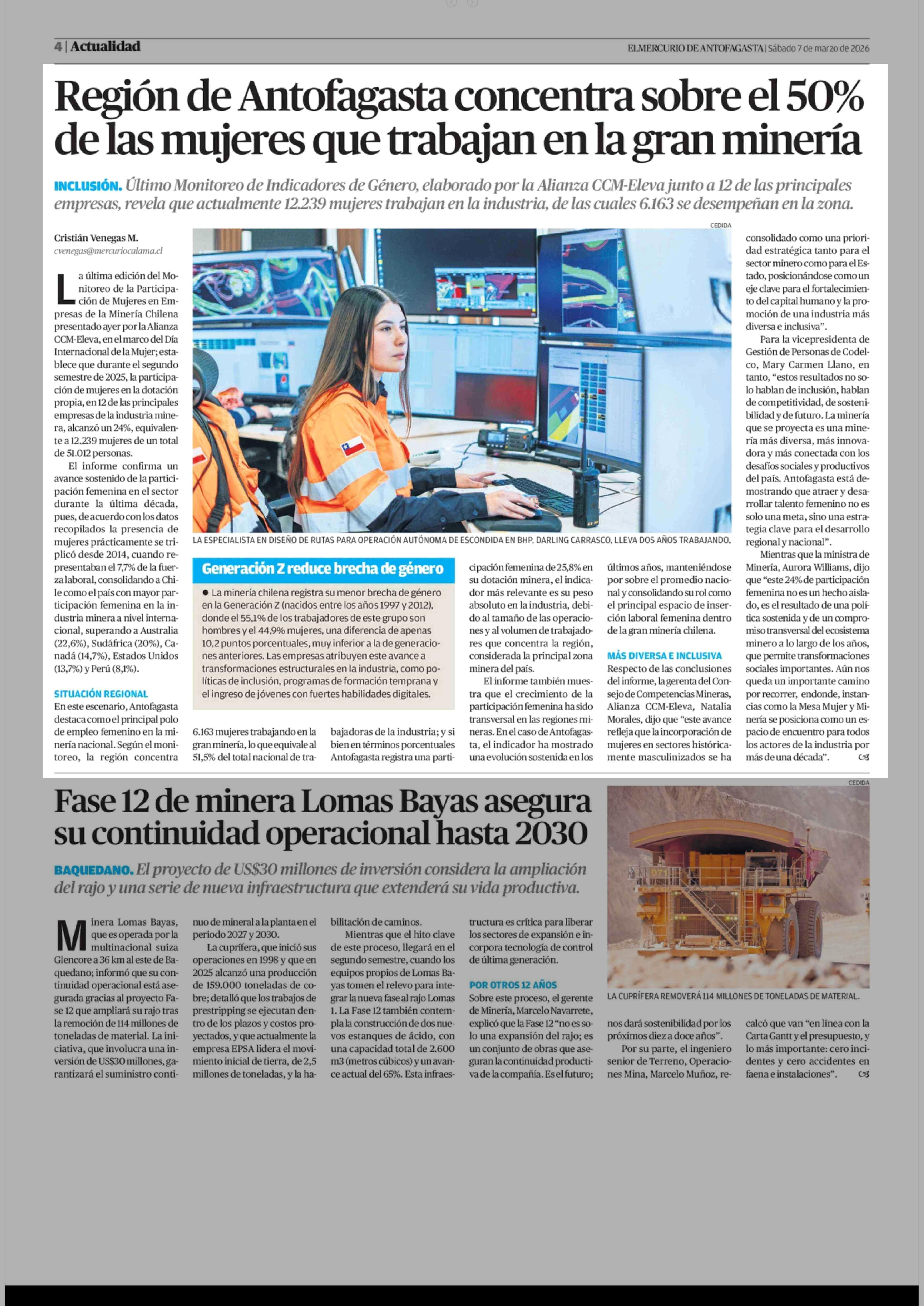 Región de Antofagasta concentra sobre el 50% de las mujeres que trabajan en la gran minería 07-03-2026 El Mercurio de Antofagasta |