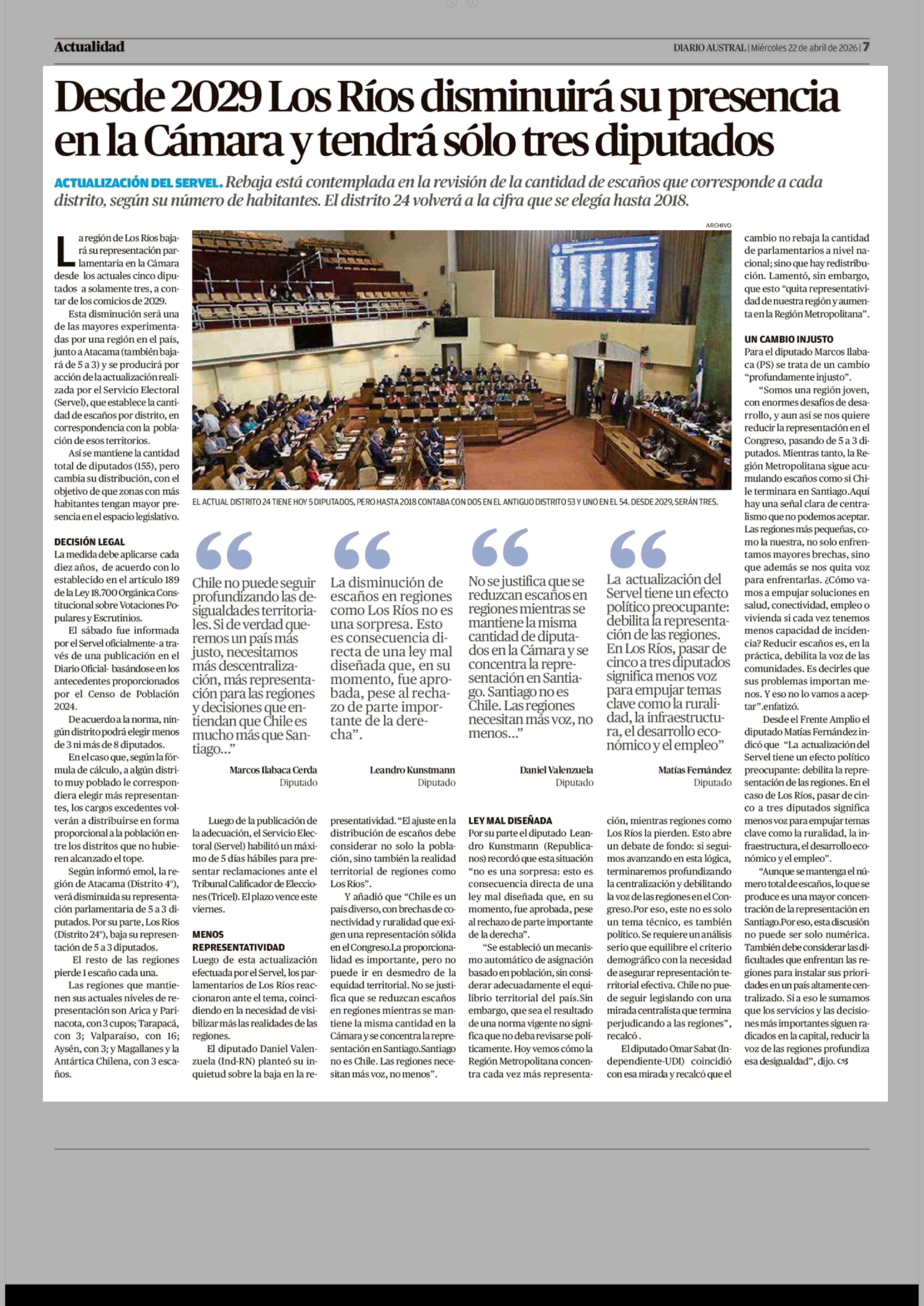 Desde 2029 Los Ríos disminuirá su presencia en la Cámara y tendrá sólo tres diputados 22-04-2026 Diario Austral Región de Los Ríos |
