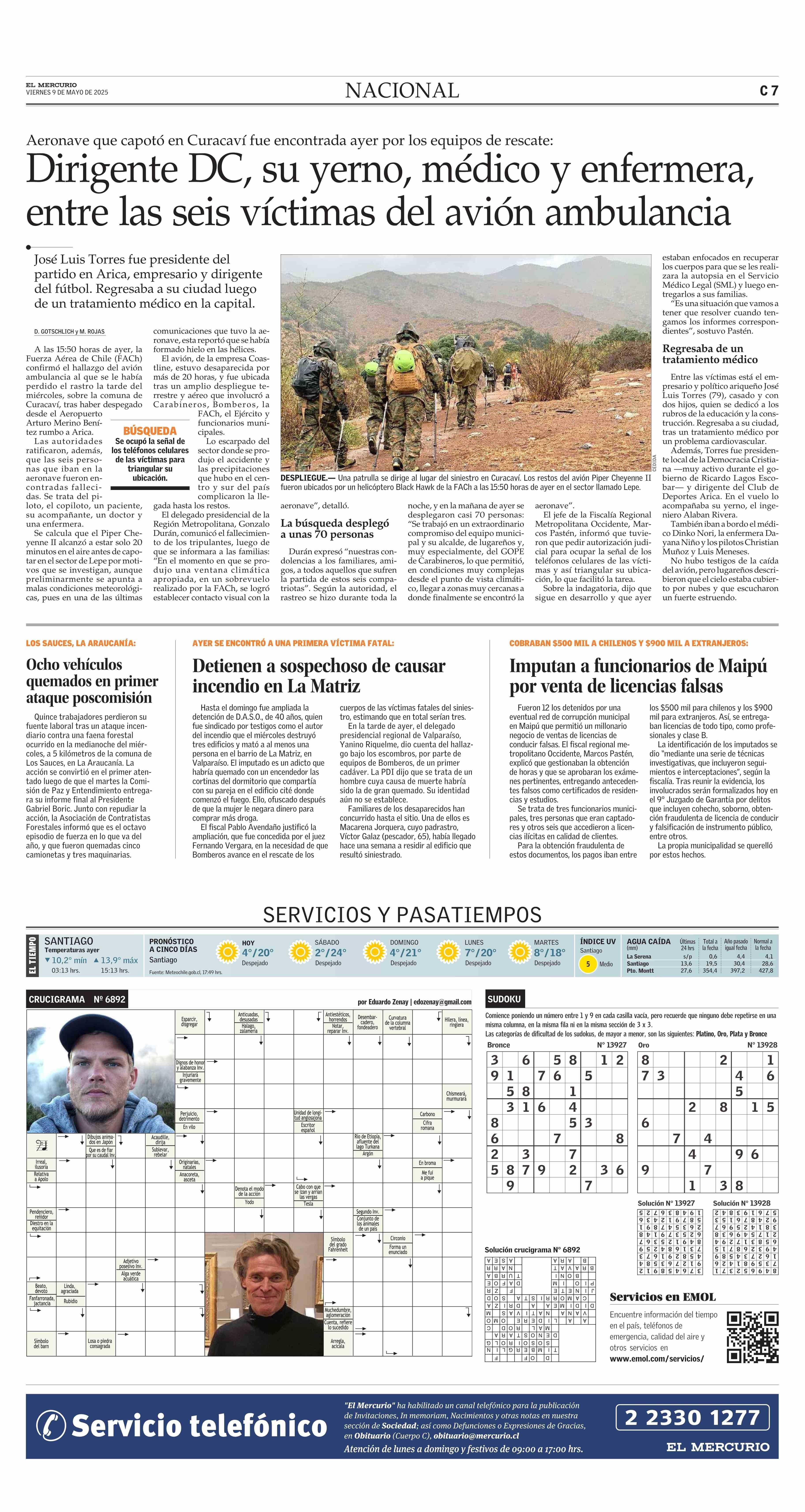 Dirigente DC, su yerno, médico y enfermera, entre las seis víctimas del avión ambulancia 09-05-2025 El Mercurio |