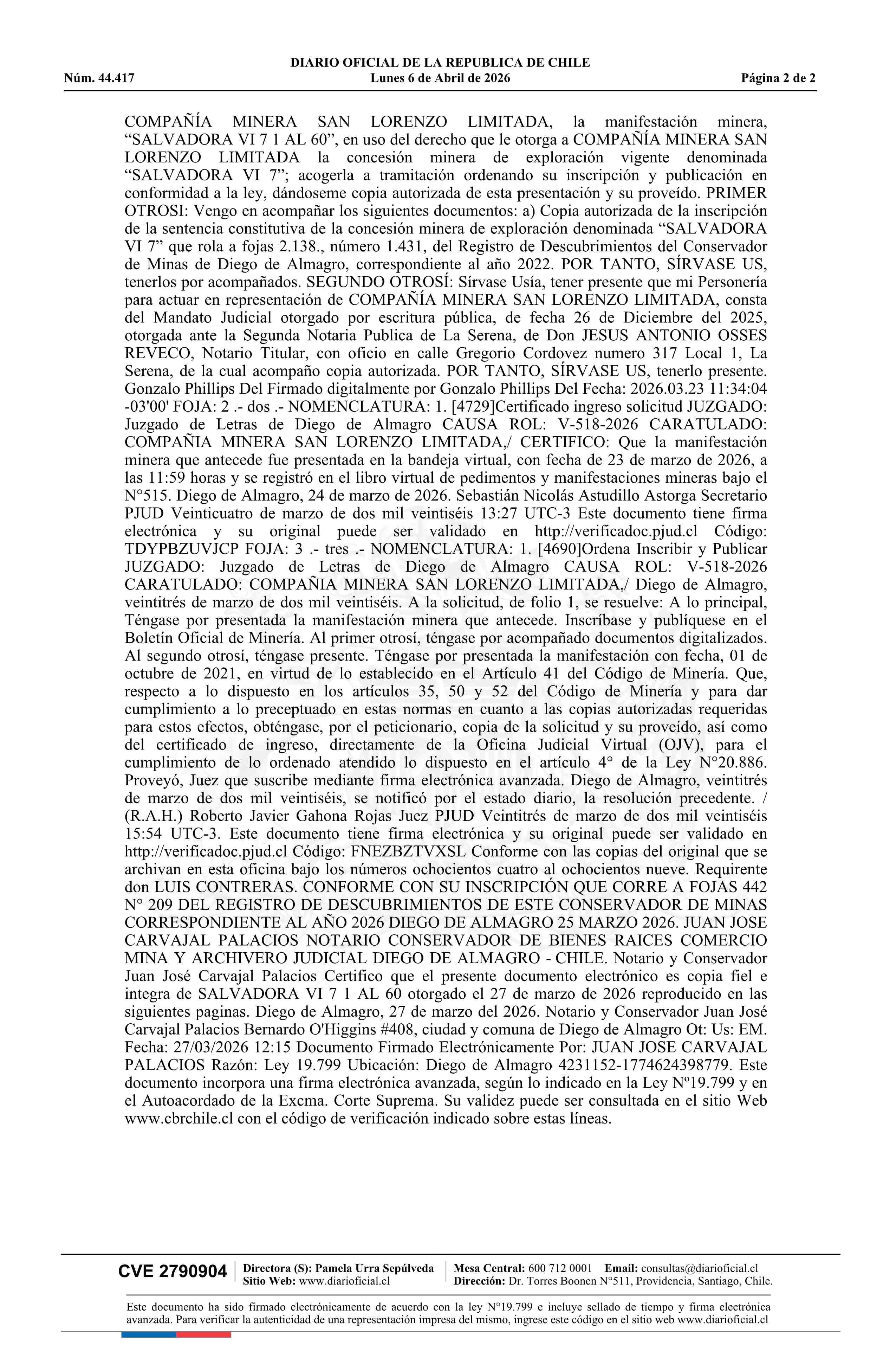SALVADORA VI 7 1 AL 60 / Compañía Minera San Lorenzo Limitada 06-04-2026 DIARIO OFICIAL CHILE - BOLETÍN OFICIAL DE MINERÍA |