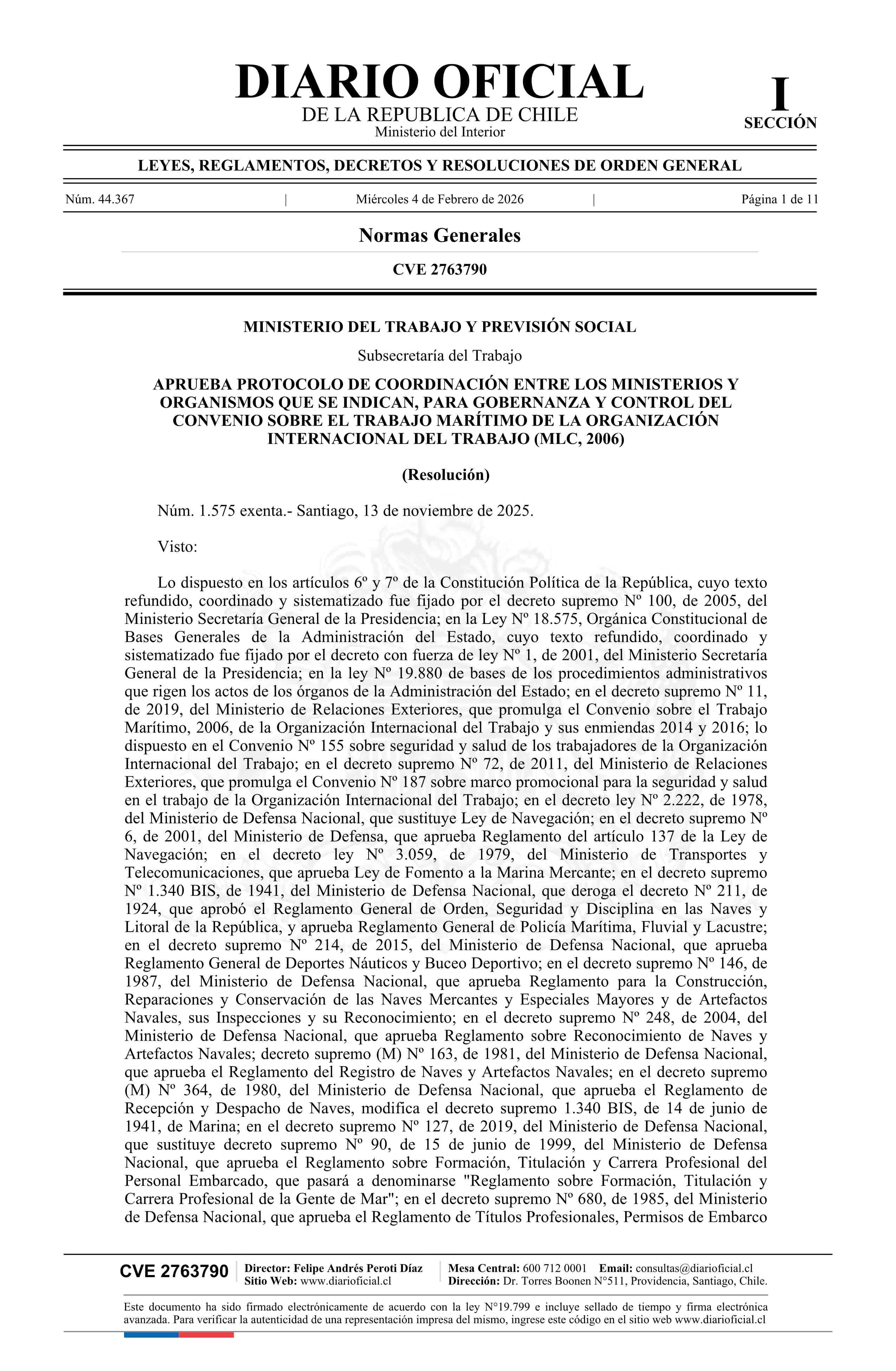 Título: Resolución exenta número 1.575, de 2025.- Aprueba protocolo de coordinación entre los ministerios y organismos que indica, para gobernanza y control del Convenio sobre el Trabajo Marítimo de la Organización Internacional del Trabajo (MLC, 2006)