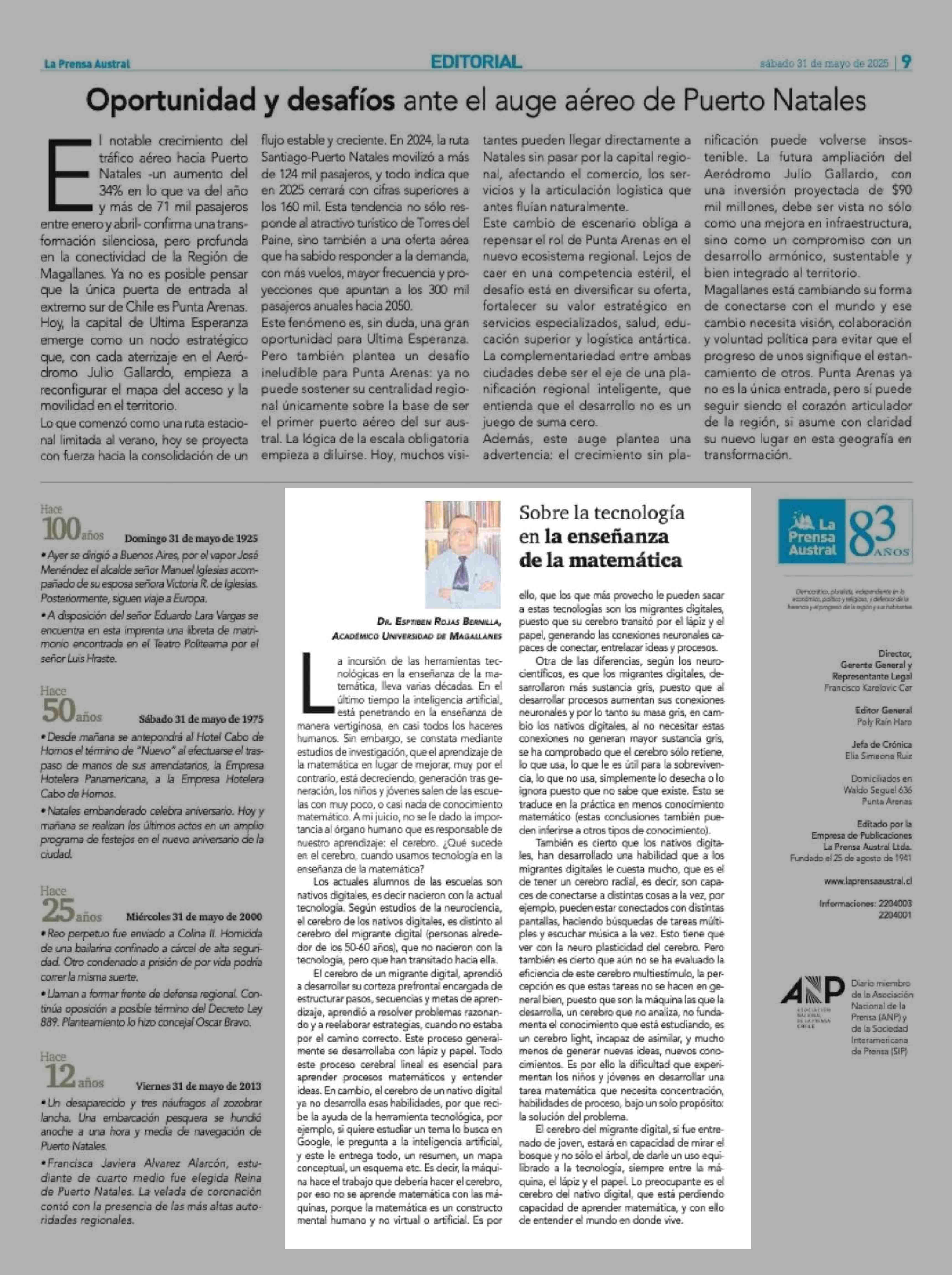 COLUMNAS DE OPINIÓN: Sobre la tecnología en la enseñanza de la matemática 31-05-2025 La Prensa Austral |