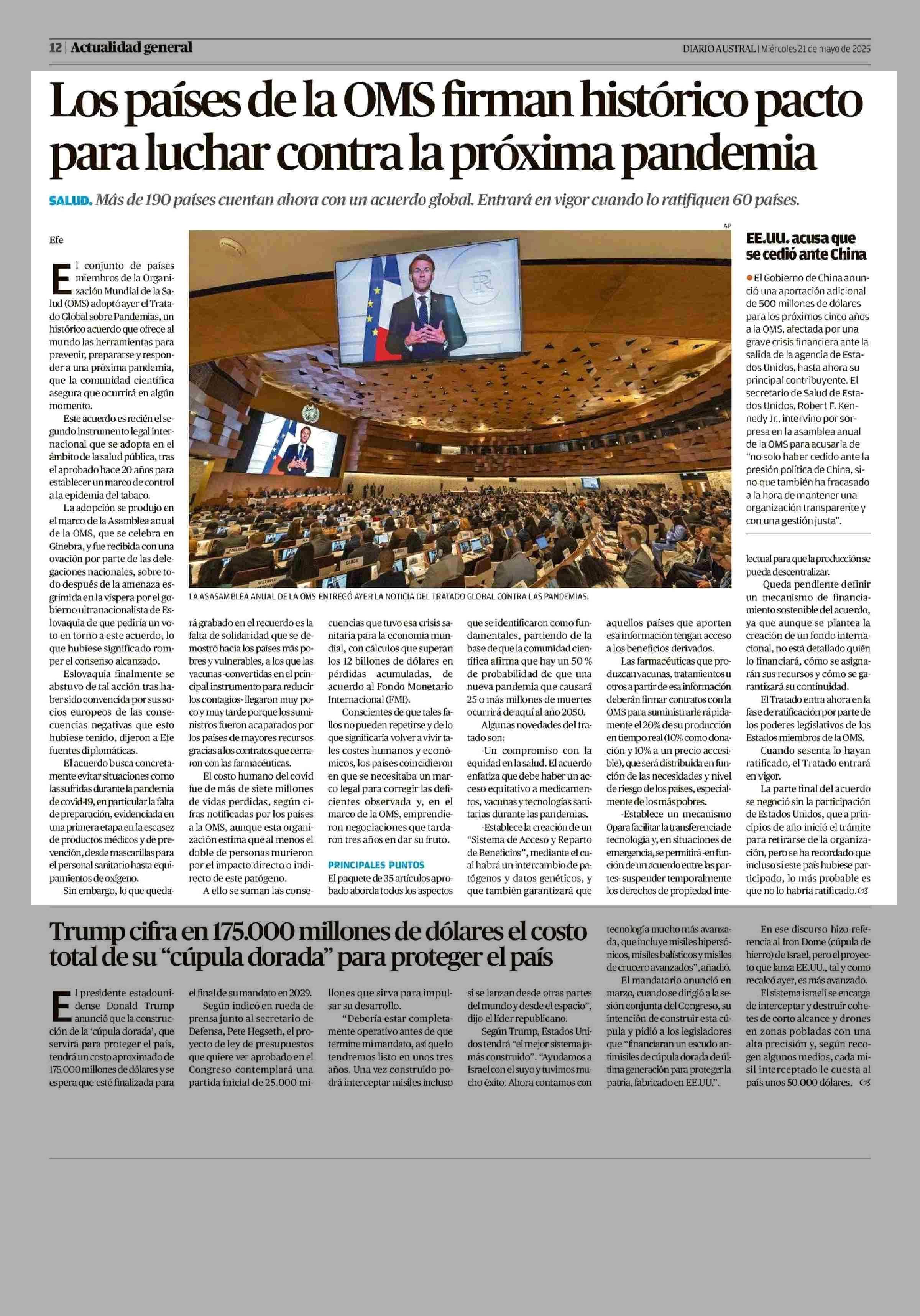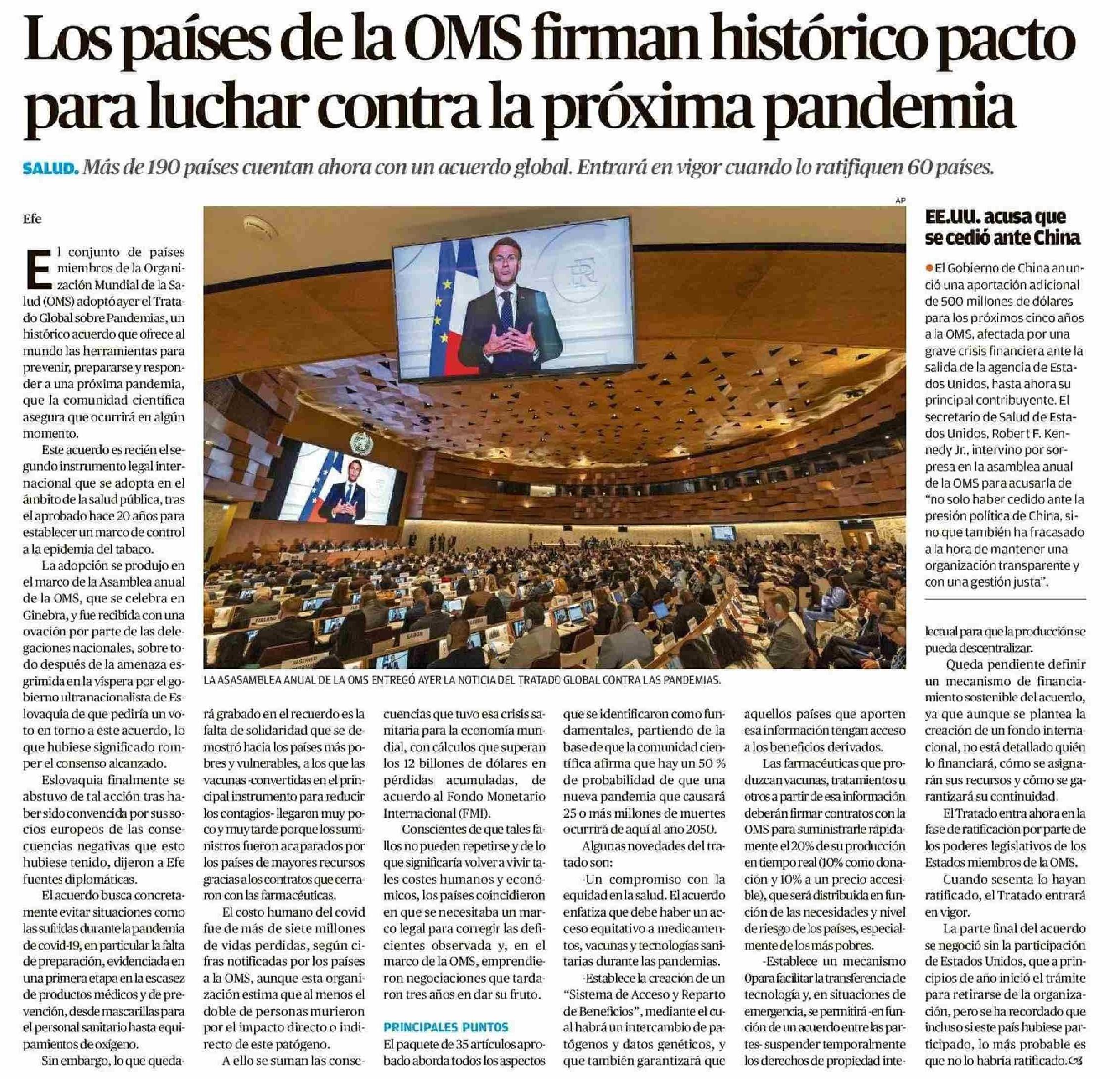 Los países de la OMS firman histórico pacto para luchar contra la próxima pandemia 21-05-2025 Diario Austral Región de Los Ríos |